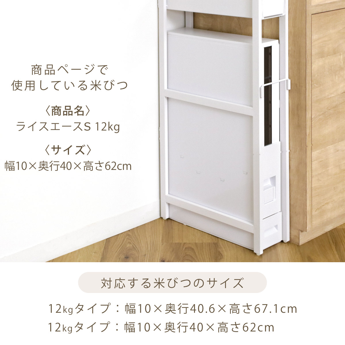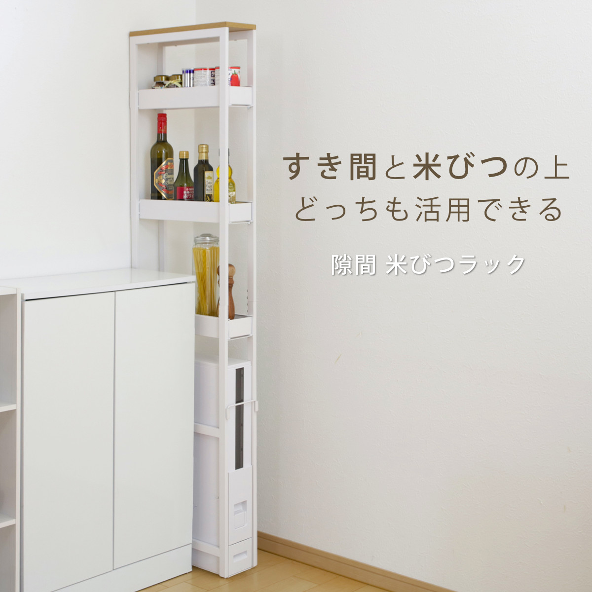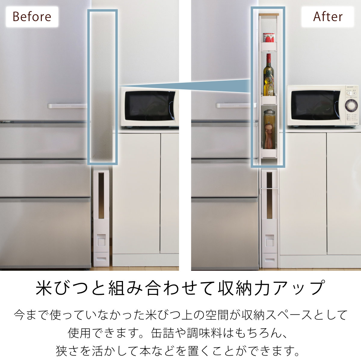 別売りのスリムタイプの米びつの上の空間を活用して、缶詰や調味料はもちろん、狭さを活かして本などを置くことができます。今まで使っていなかった米びつ上の空間が収納スペースとして使用できます。