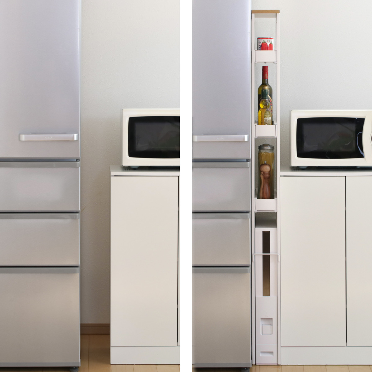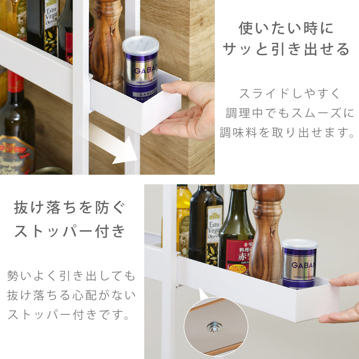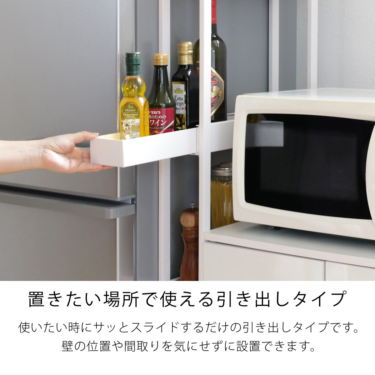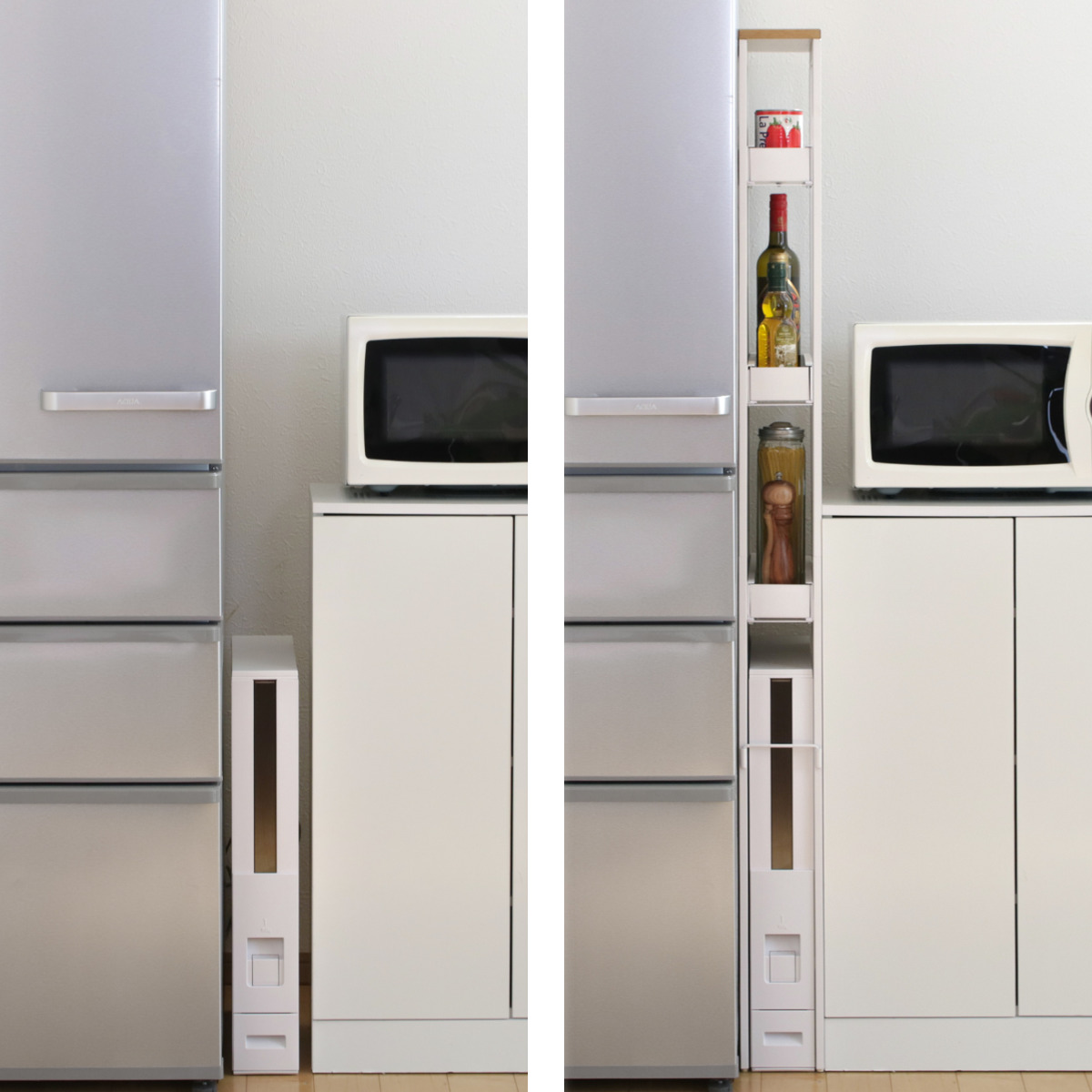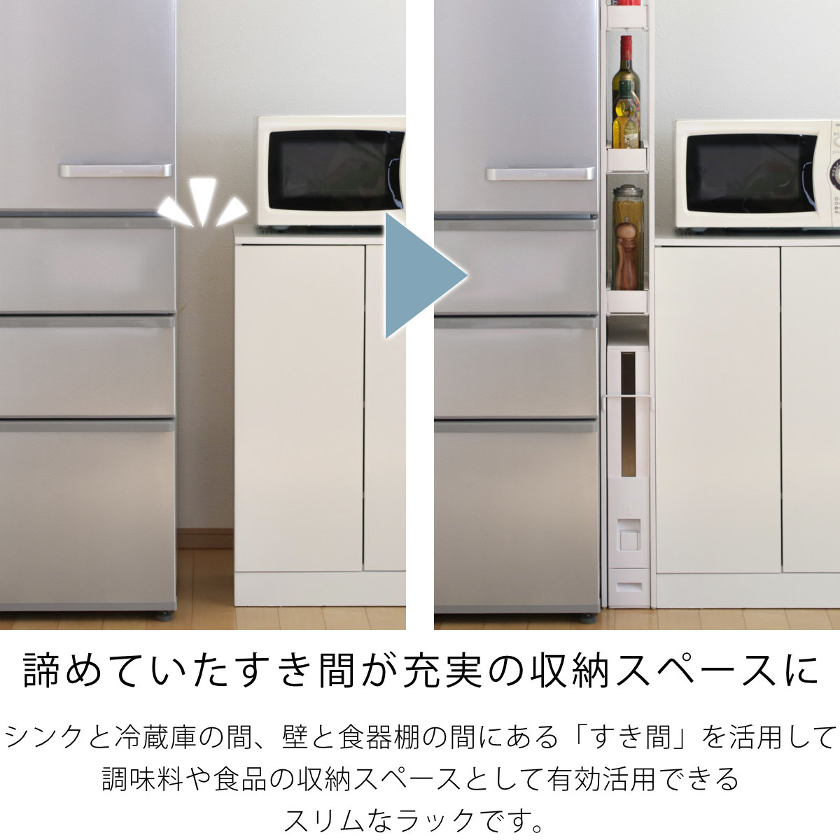 今まで使えていなかった「すき間」を活用して調味料や食品の収納スペースとして有効活用できます。本体はスリムながら高さがありたっぷり収納できます。
