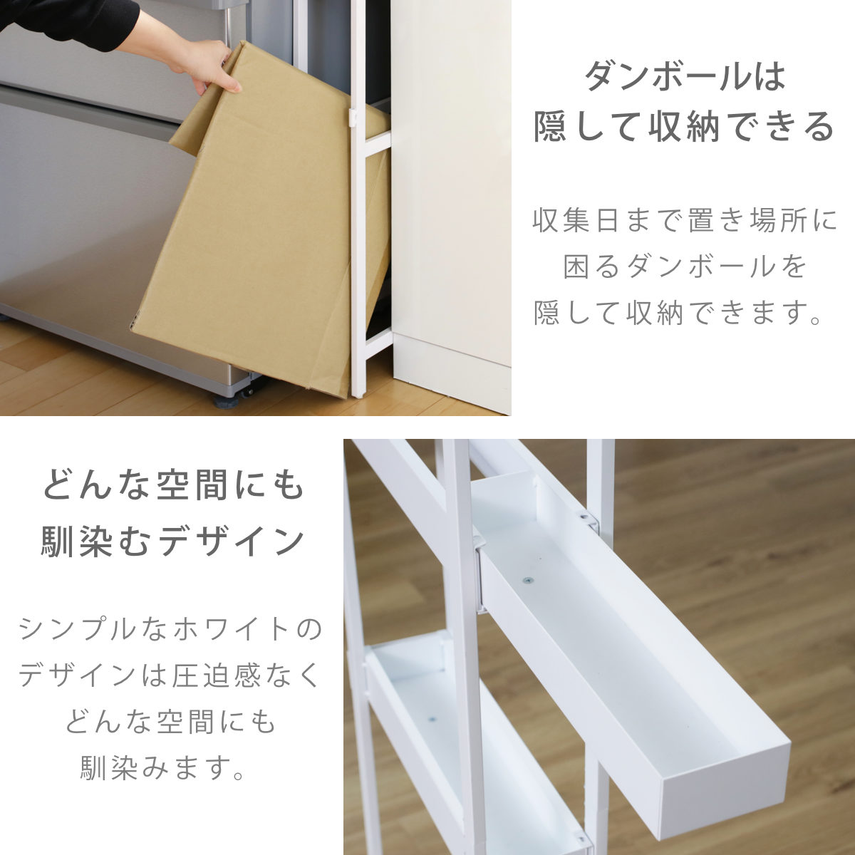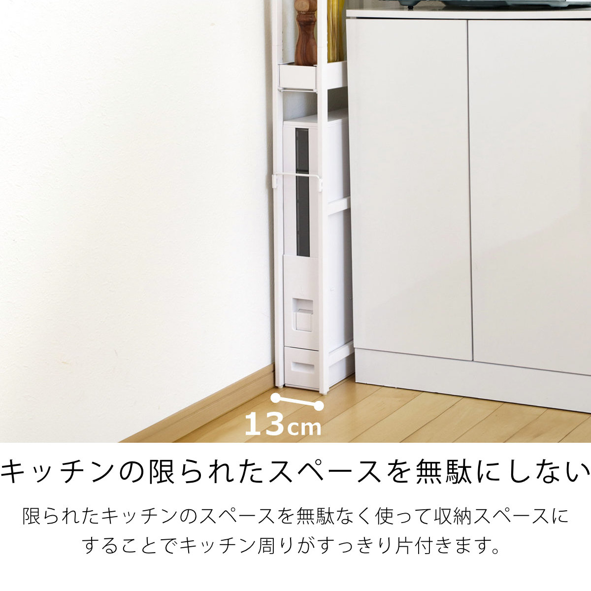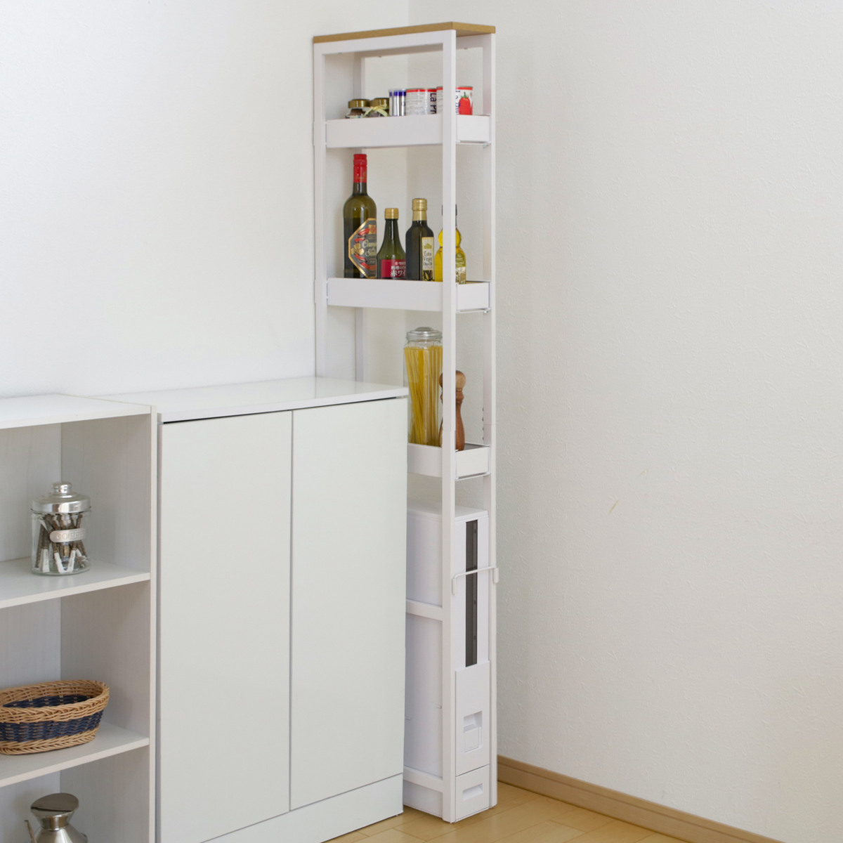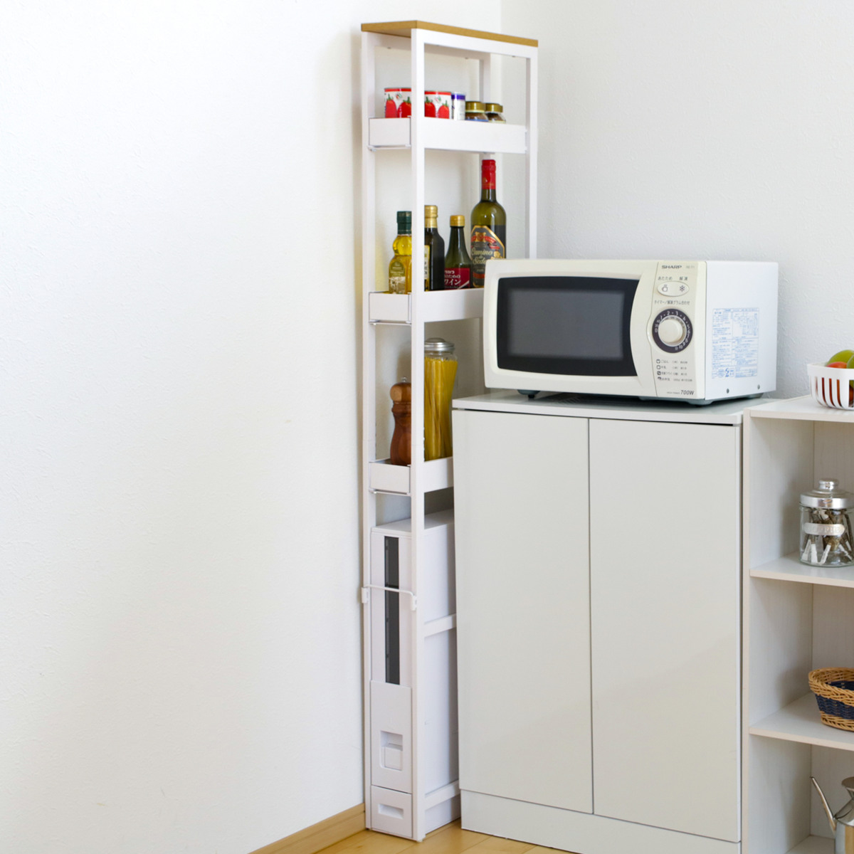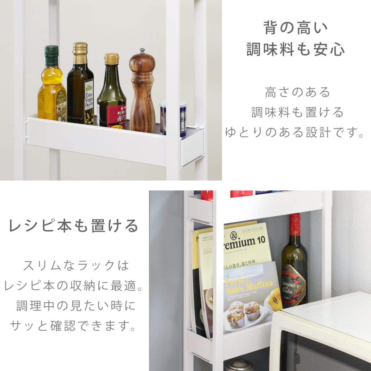 今まで使えていなかった「すき間」を活用して調味料や食品の収納スペースとして有効活用できます。本体はスリムながら高さがありたっぷり収納できます。