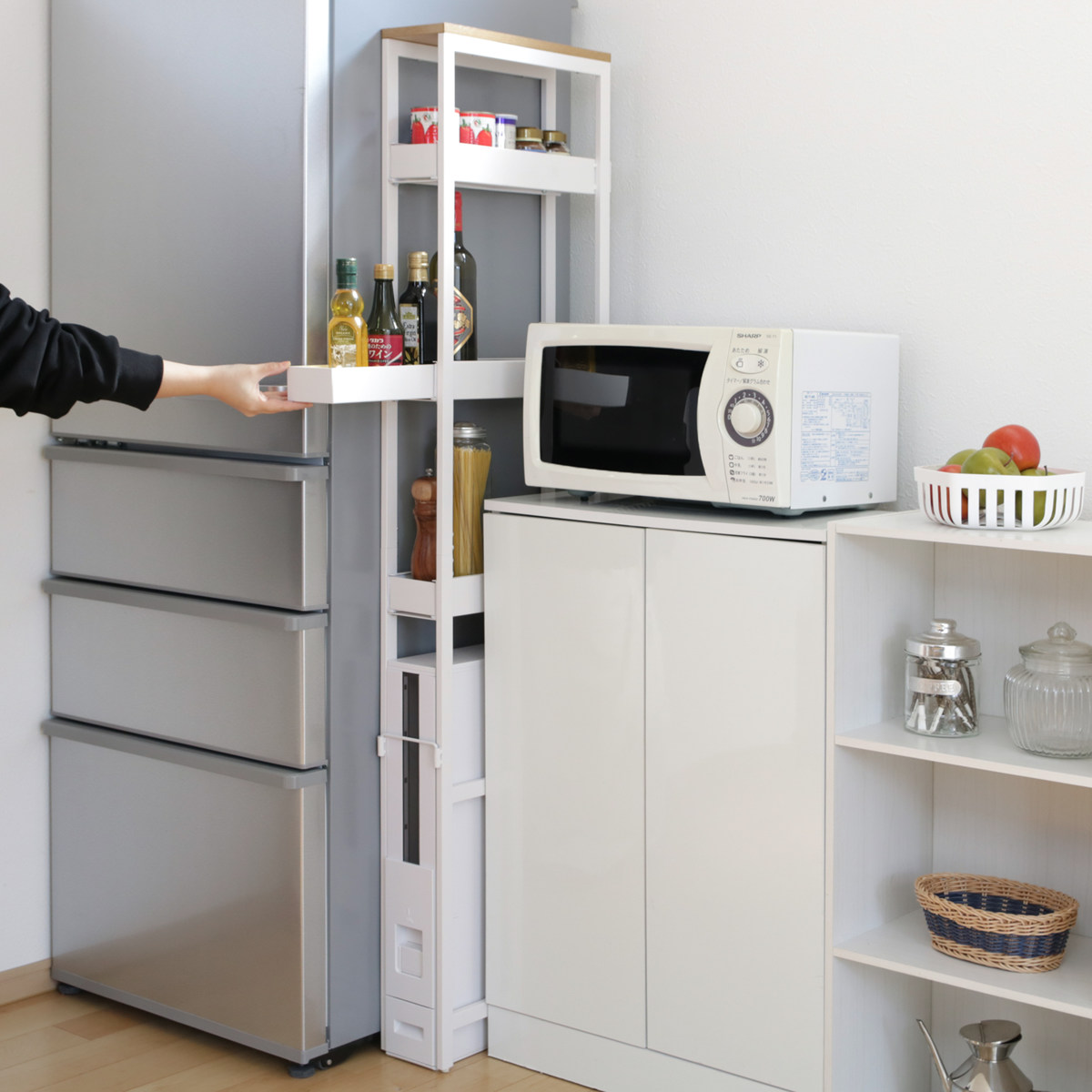 シンクと冷蔵庫の間、壁と食器棚の間にあるわずかな「すき間」を収納スぺースとして使えるスリムなラックです。