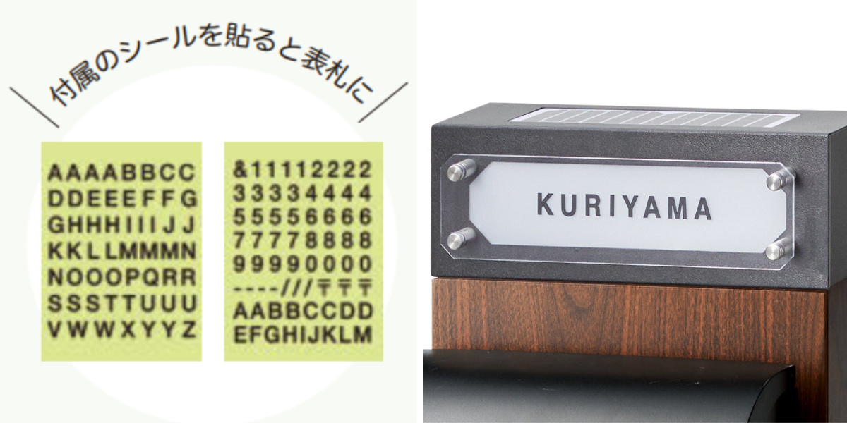 黒色のアルファベッドと数字のシール付きです。シールを張ると表札として使えます。