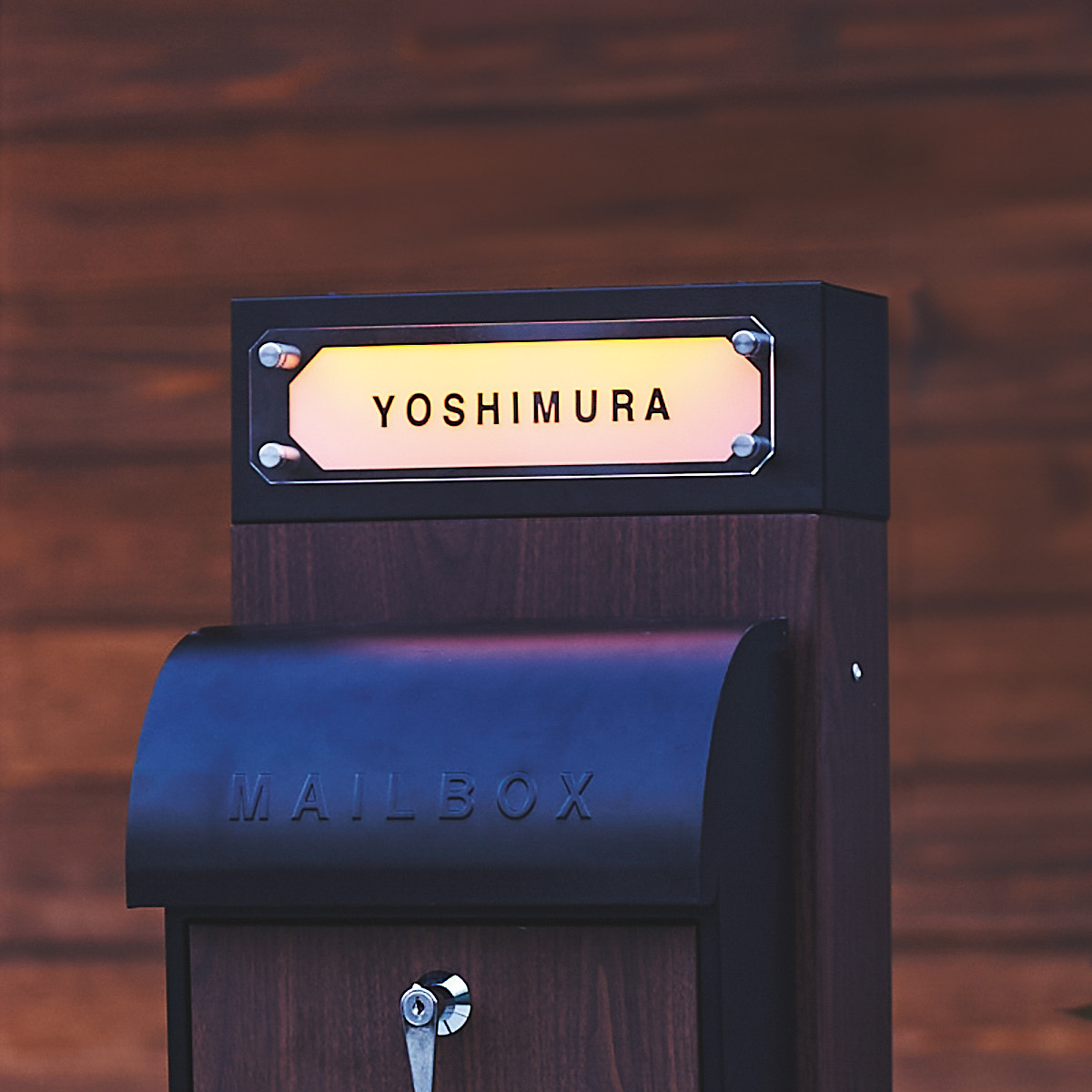 枕木のような木目のソーラーネームライト付きのポスト用スタンド