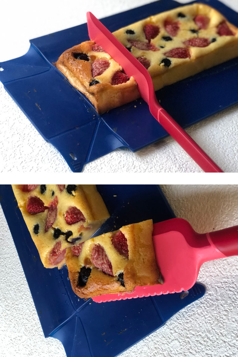焼きあがったケーキは、型を広げてそのままカッティングサーバーで切り分けができます。お皿への取り分けもそのままできるから、まな板と包丁とサーバーを用意する必要がなく、洗い物も減って片付けが楽になります。
