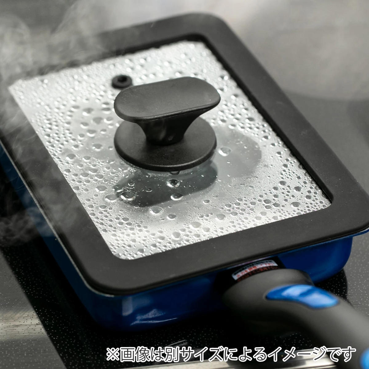 9×18cmの卵焼き器用のフタです。耐熱性・耐油性に優れたシリコンゴムを使用しています。ガラス窓の周りがシリコン素材で本体に密着しやすい形です。