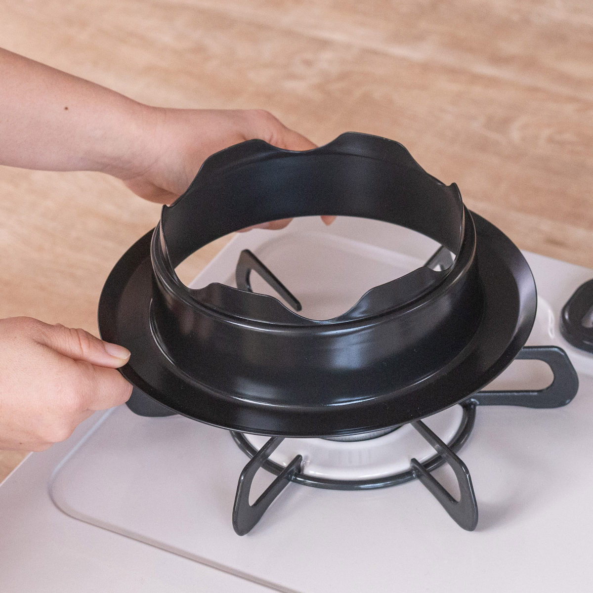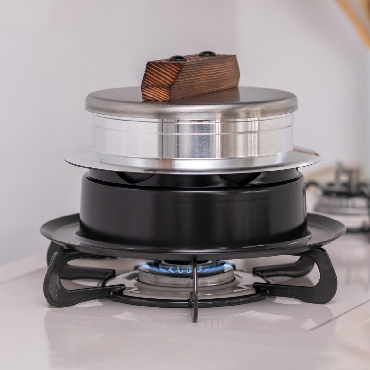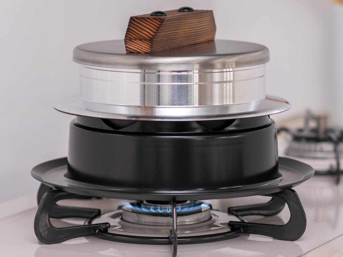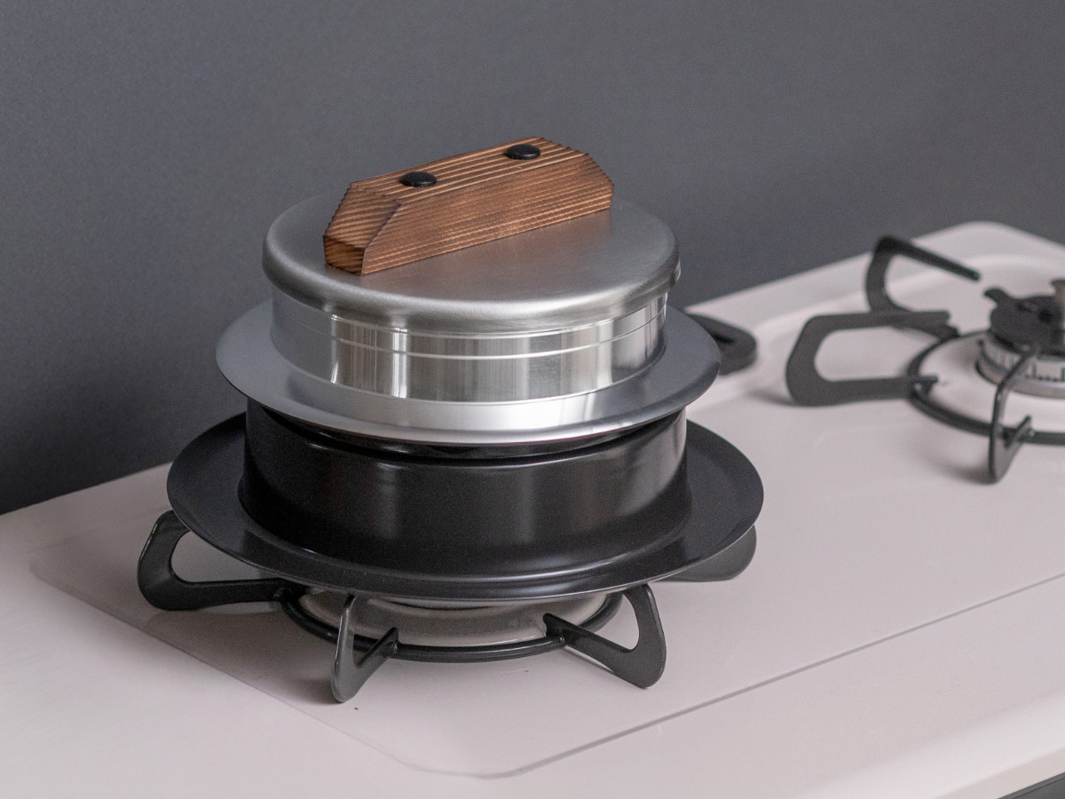 2.ガスコンロの五徳の上にかまどを置き、釜をのせる。蓋をして中火で加熱を開始する。