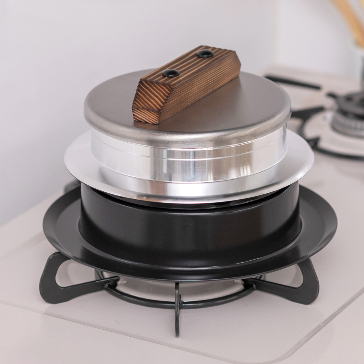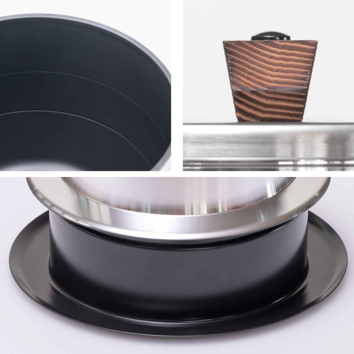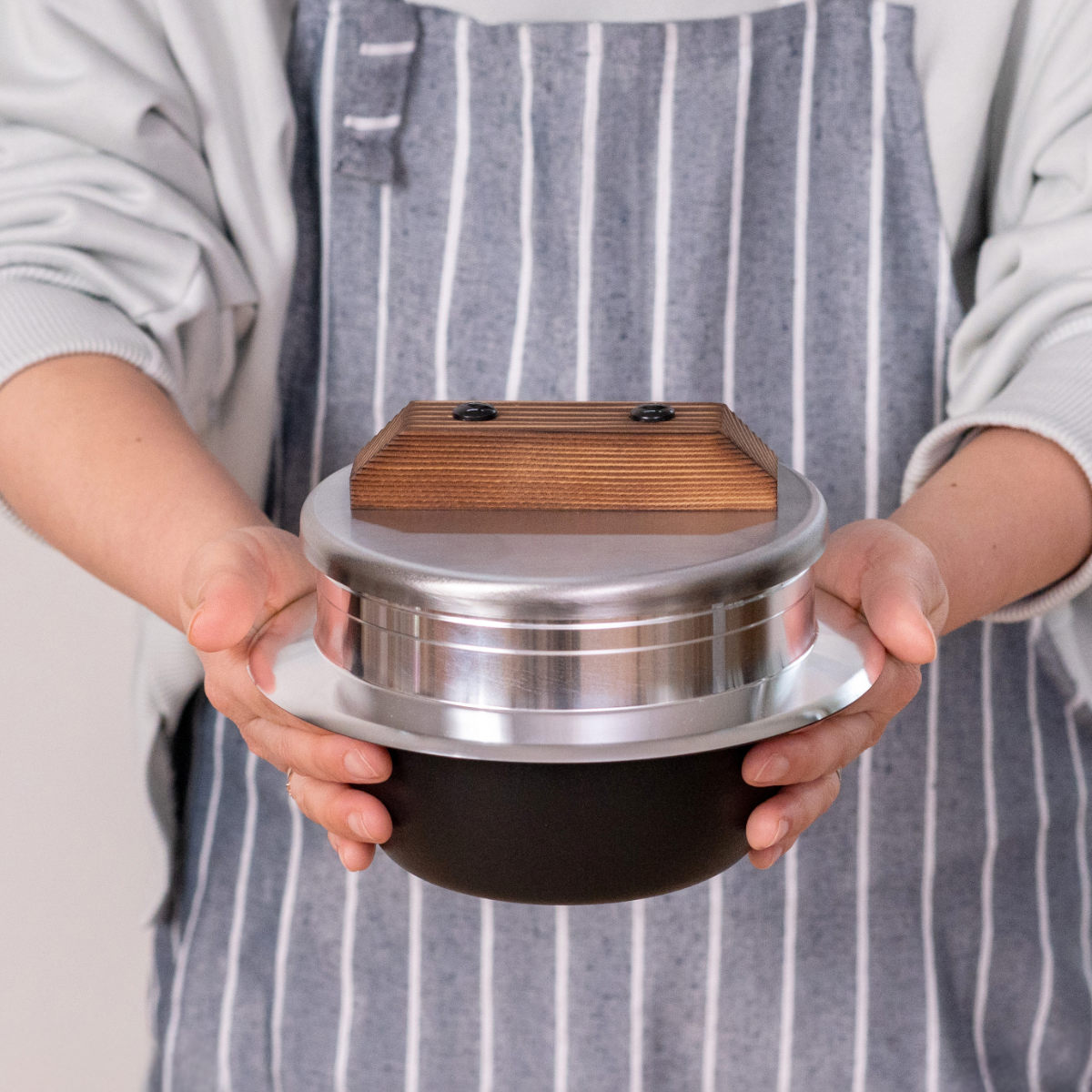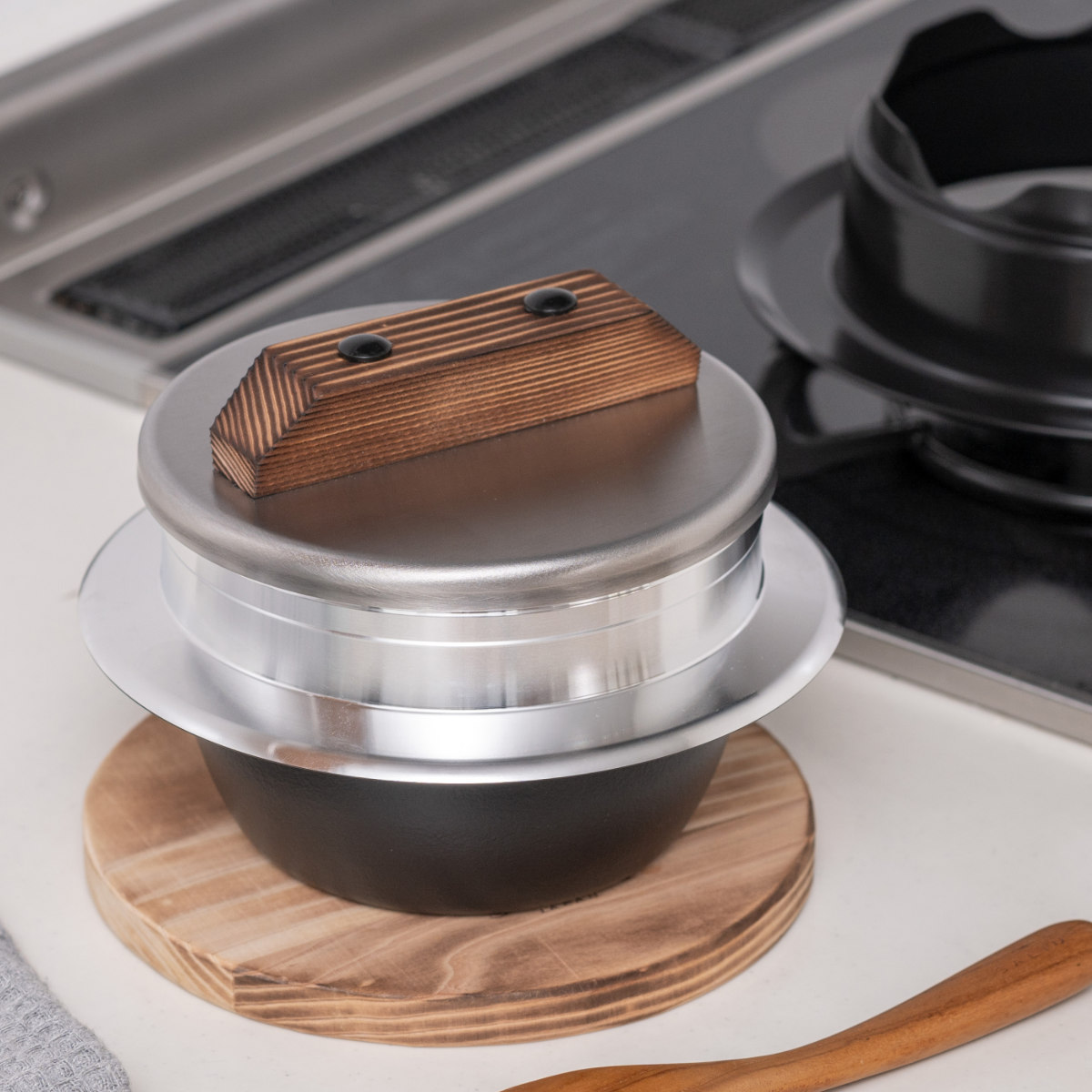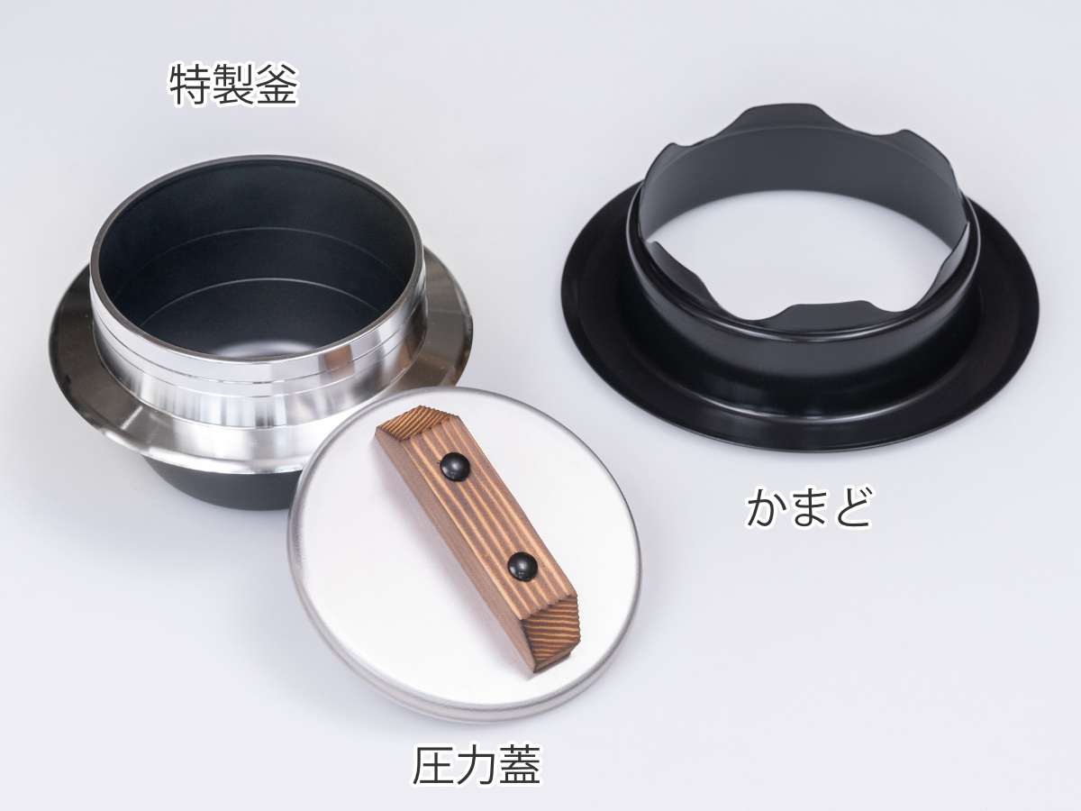 | 材質 | 【蓋】本体:ステンレス鋼、ツマミ:天然木 【釜】本体:アルミニウム合金、内面:セラミック塗膜加工、外面:施盤加工、つば下:耐熱焼付け塗装(セラミック塗装) 【かまど】本体:アルミニウム合金、内面:焼付け塗装(セラミック塗装)、外面:セラミック塗膜加工 |