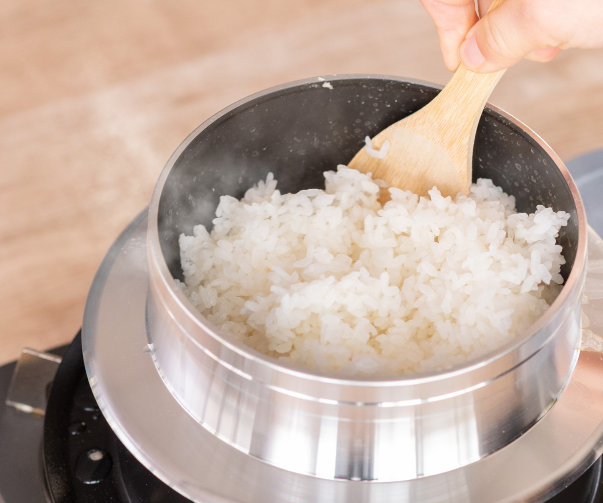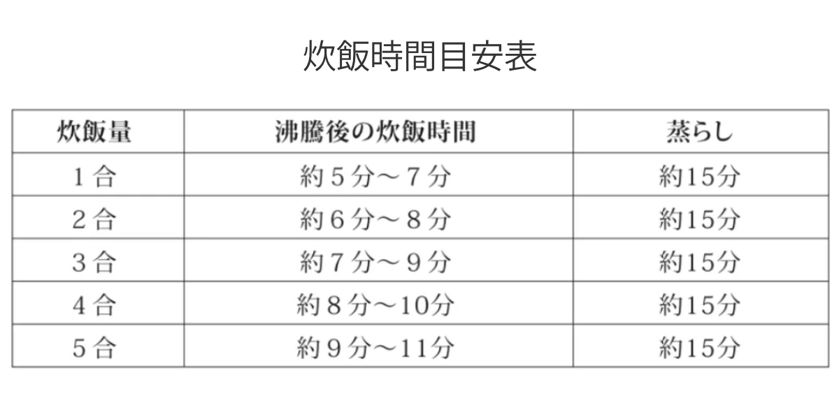 3.沸騰したら(吹きこぼれたり、蓋がカタカタと動き始めたら)、弱火にし、炊飯量に合わせて加熱する。
