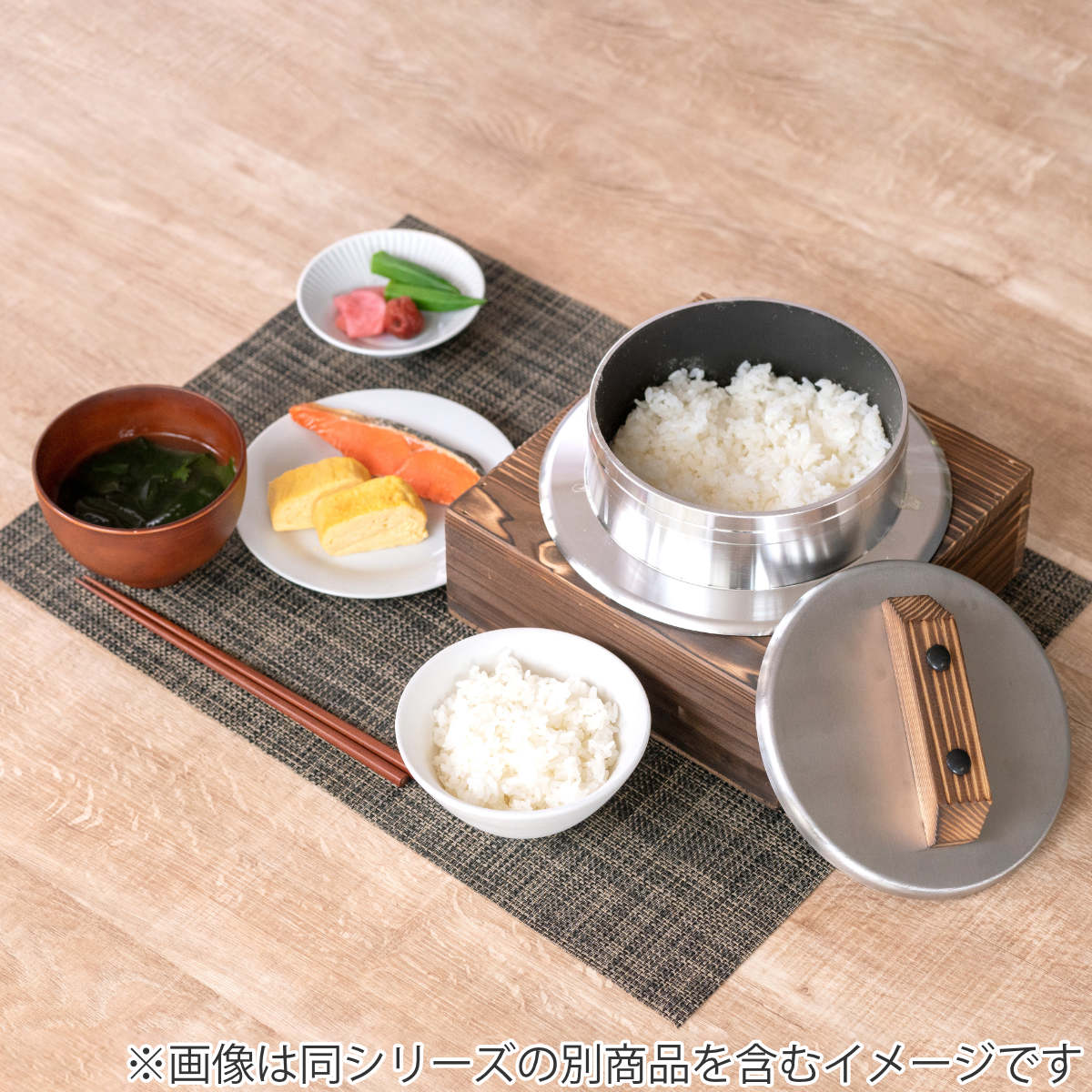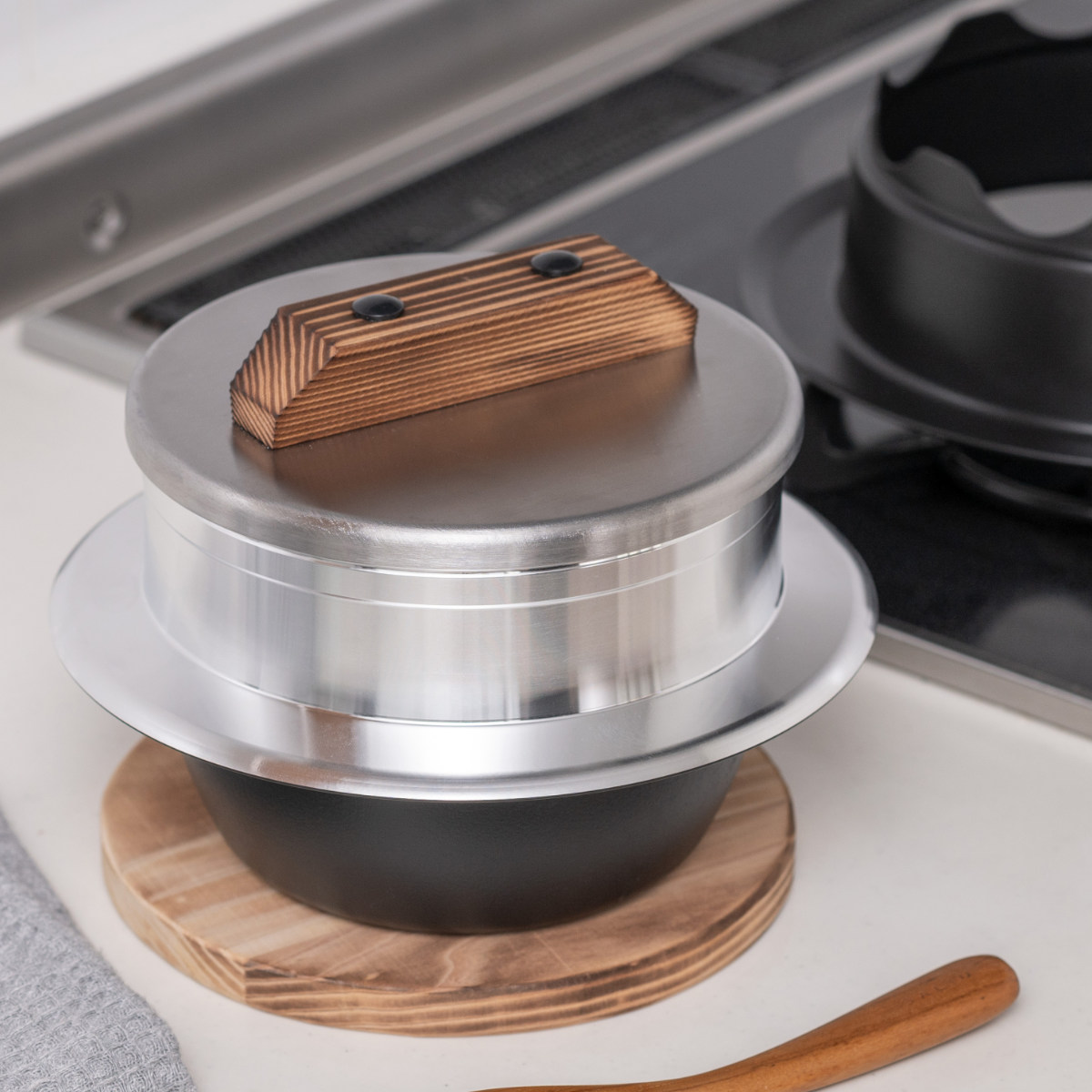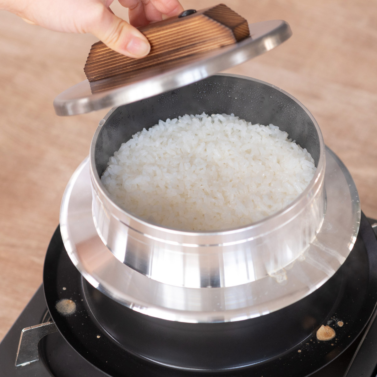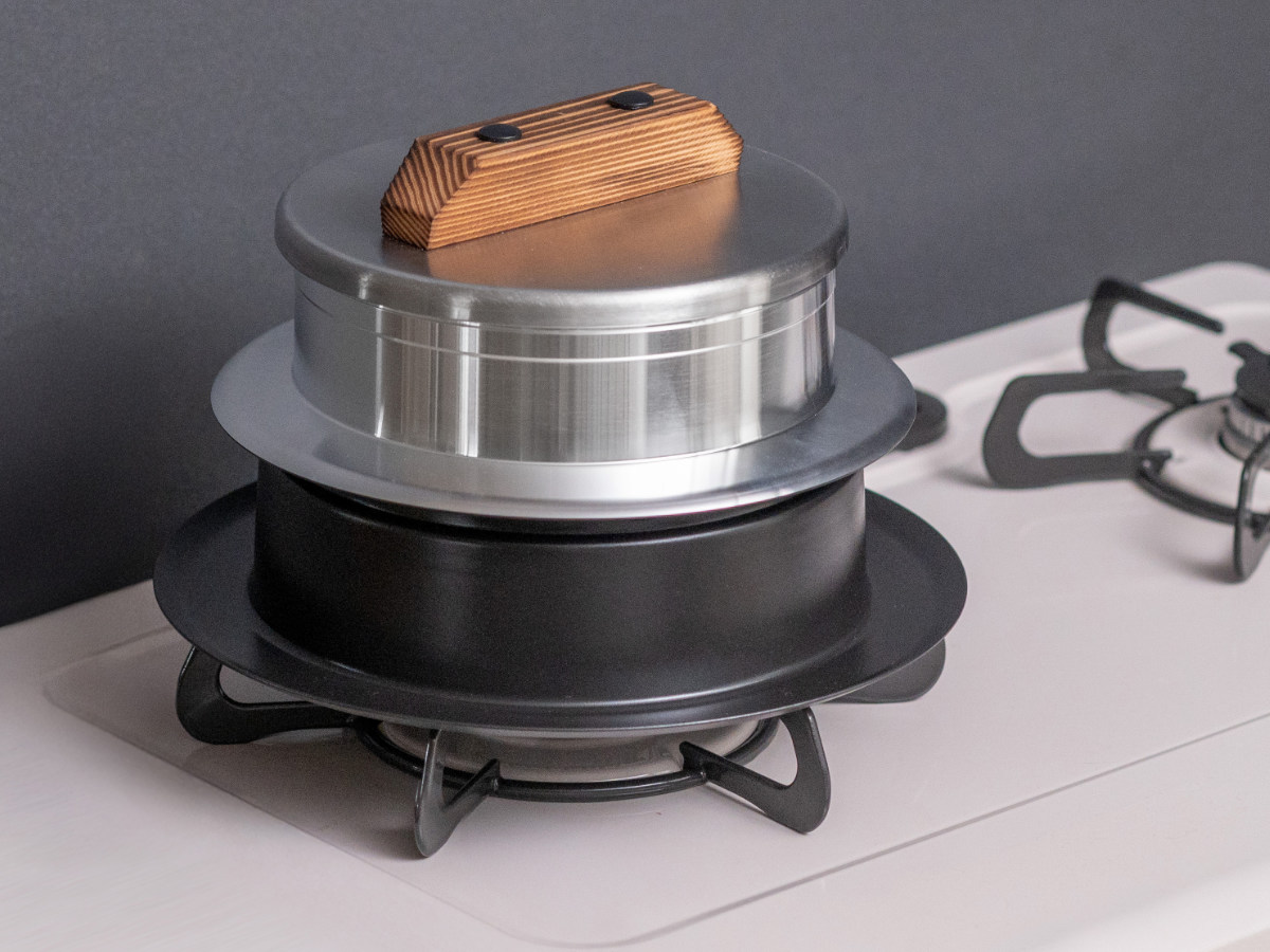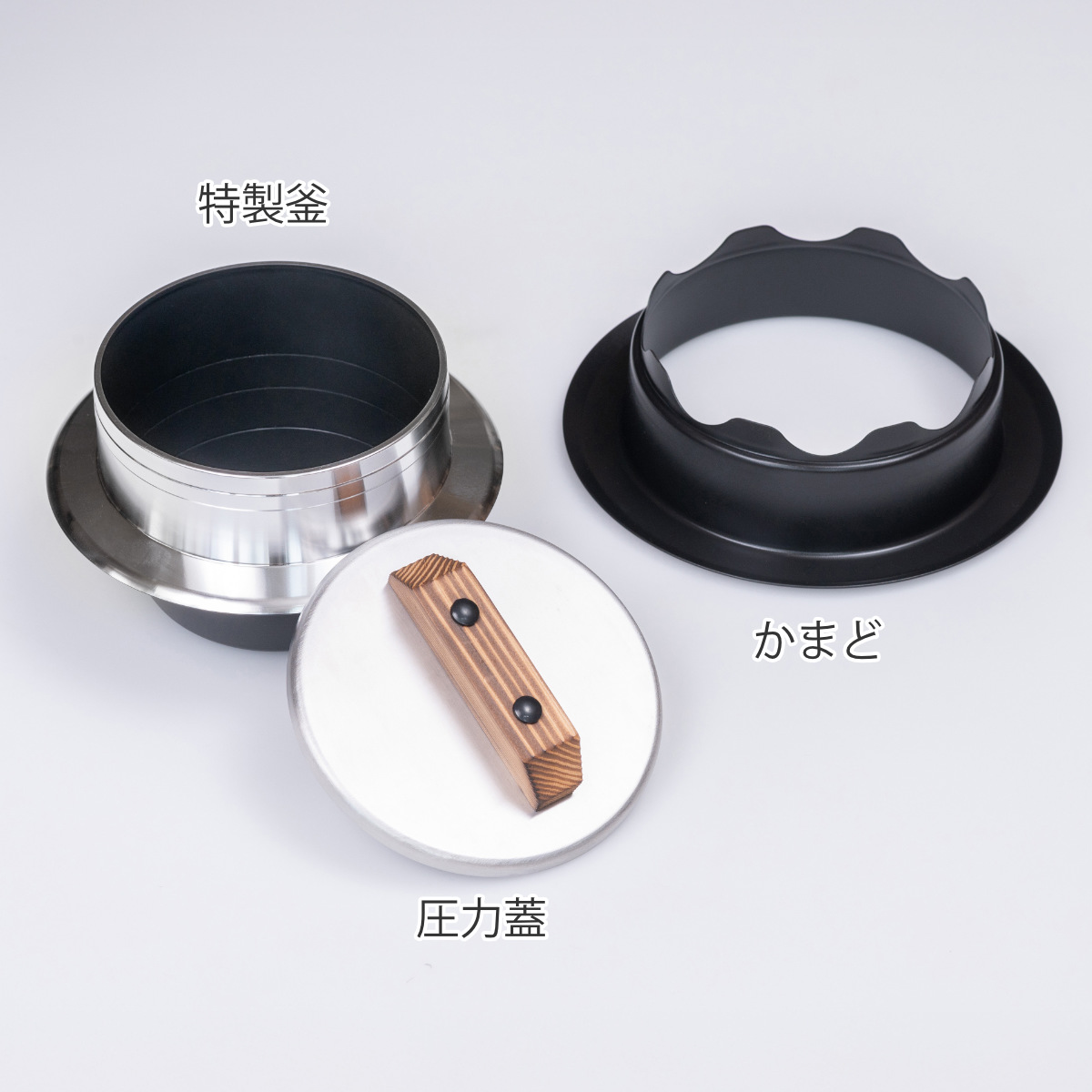 | 材質 | 【蓋】本体:ステンレス鋼、ツマミ:天然木 【釜】本体:アルミニウム合金、内面:セラミック塗膜加工、外面:施盤加工、つば下:耐熱焼付け塗装(セラミック塗装) 【かまど】本体:アルミニウム合金、内面:焼付け塗装(セラミック塗装)、外面:セラミック塗膜加工 |