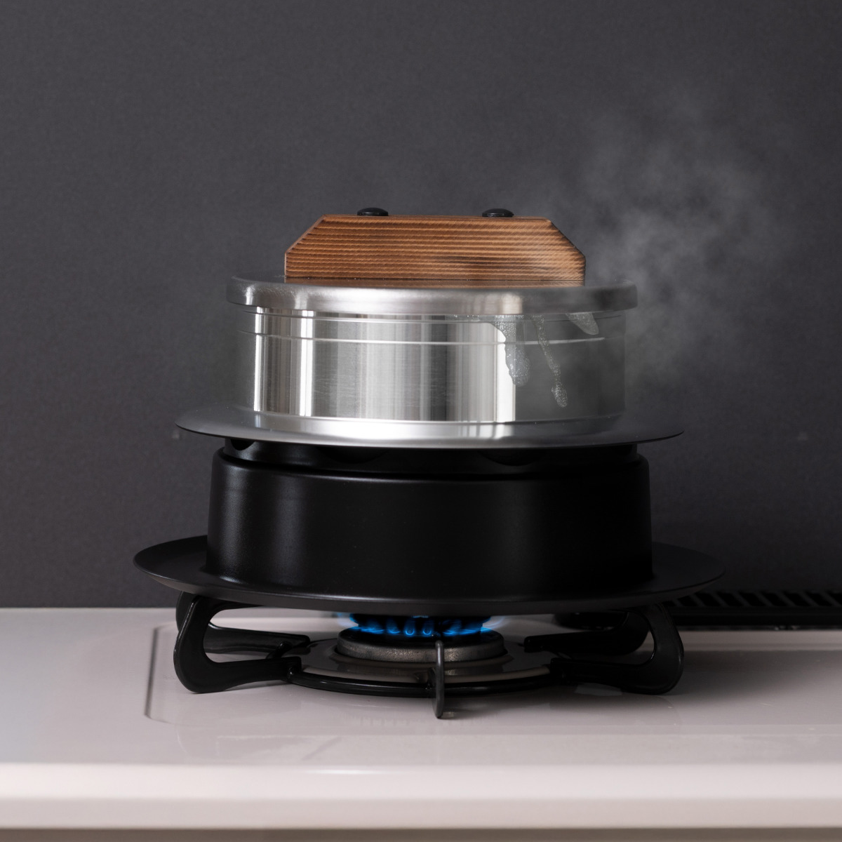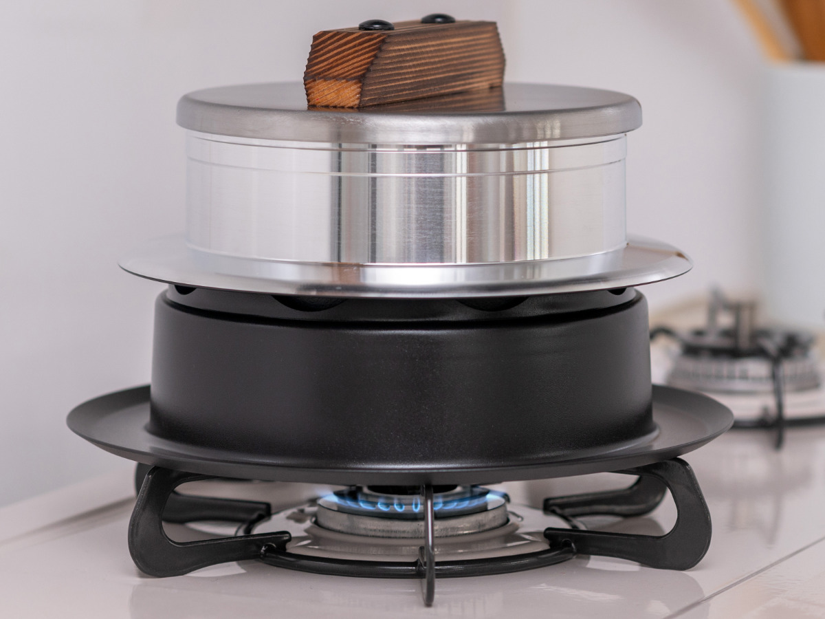 2.ガスコンロの五徳の上にかまどを置き、釜をのせる。蓋をして中火で加熱を開始する。