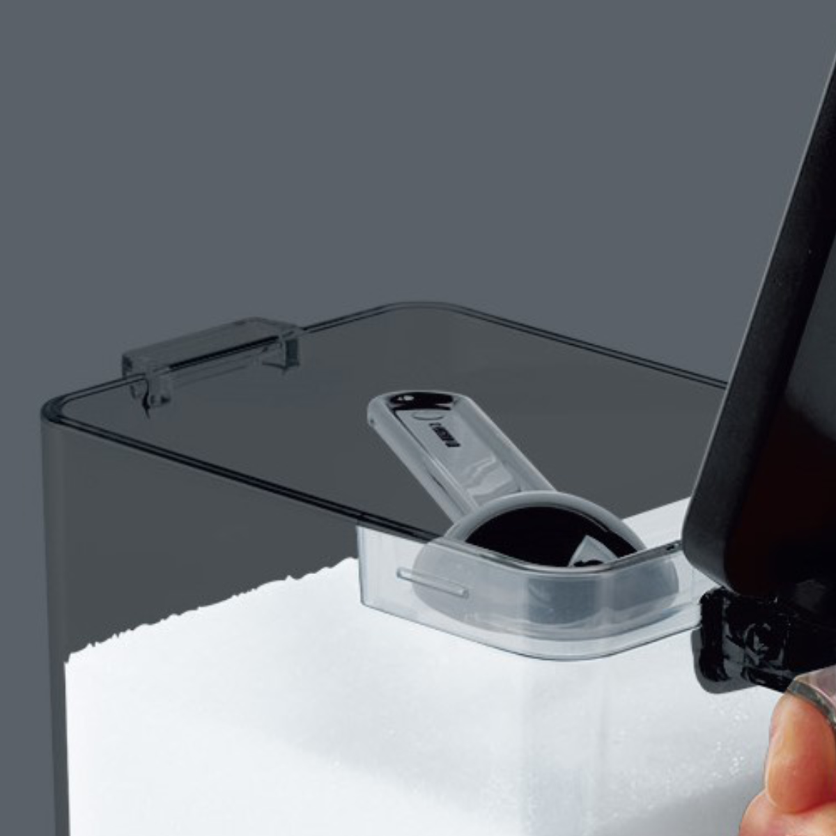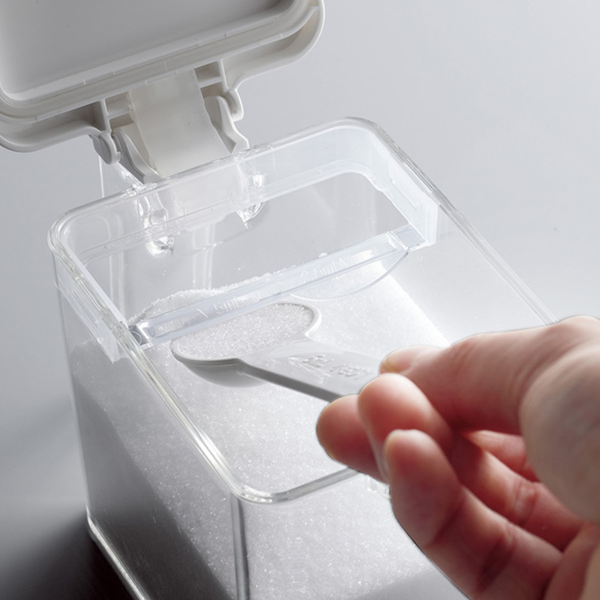 | 材質 | 本体・フタ:ポリスチレン すり切り板・スプーン:ポリプロピレン プッシュレバー:ABS樹脂 バネ・パッキン:シリコーンゴム |