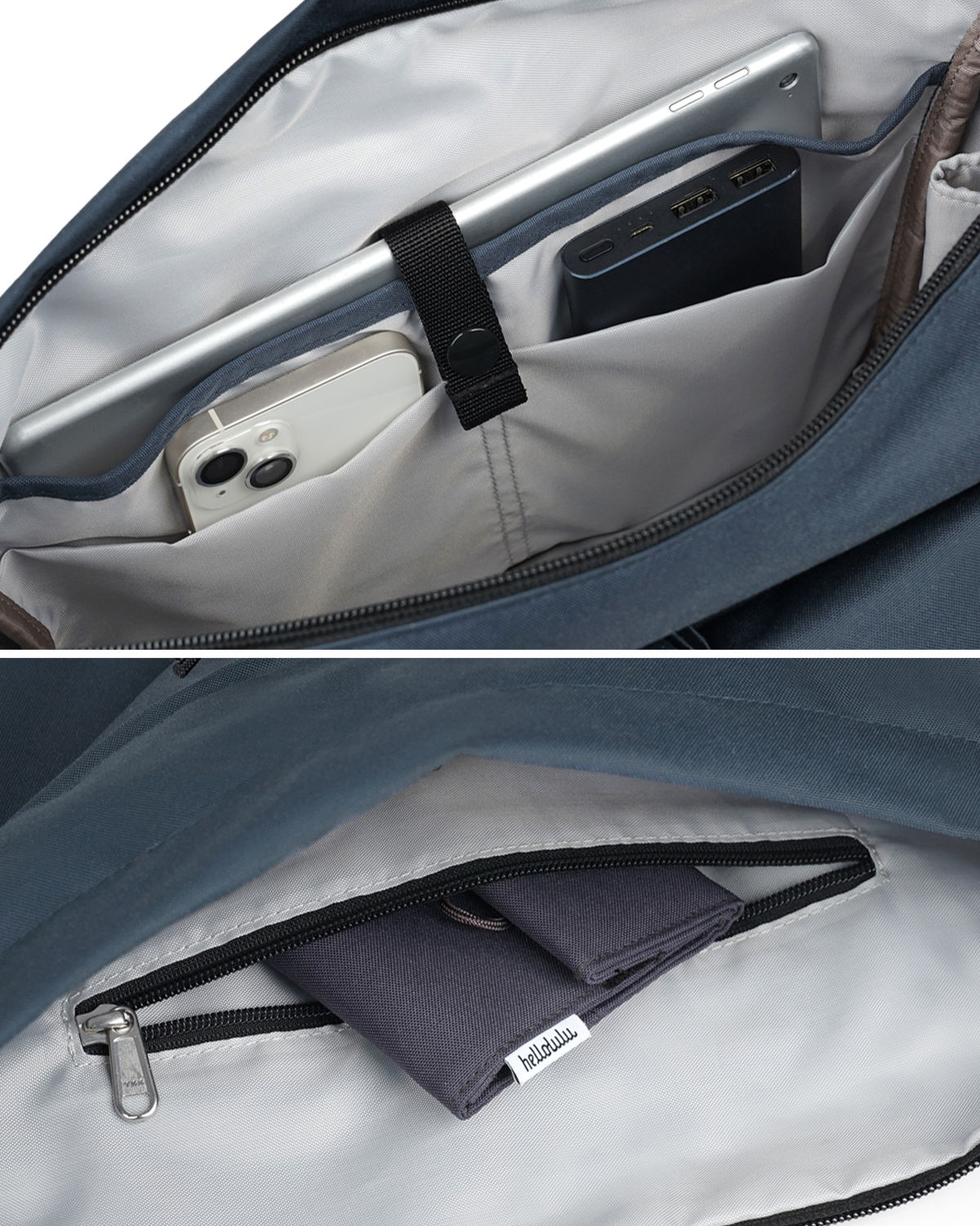 メイン収納は、中身が整理しやすい大小のポケットが付いた充実収納。小物類が迷子になりにくく、荷物もスムーズに出し入れができます。タブレットが入るポケットは、最大11インチまでのタブレットが収納可能です。パット入りなので、大切なタブレットをしっかりと守ります。