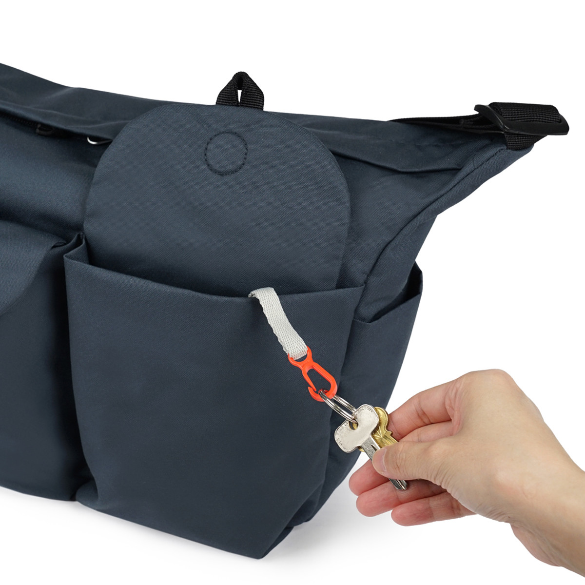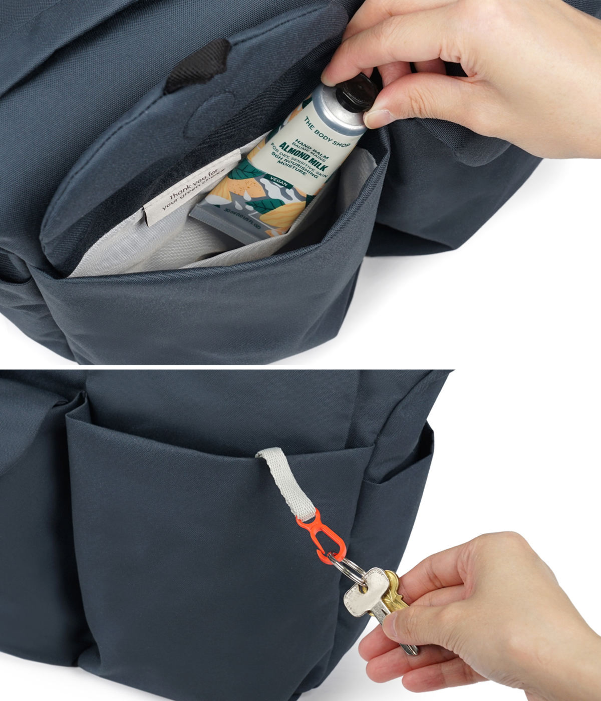 前面にはマグネット留めの大容量ポケットが2つ付いており、ハンドクリームやイヤホンなどの小物をすぐ取り出せます。ポケット片側には鍵などを引っ掛けられるキークリップ付きです。