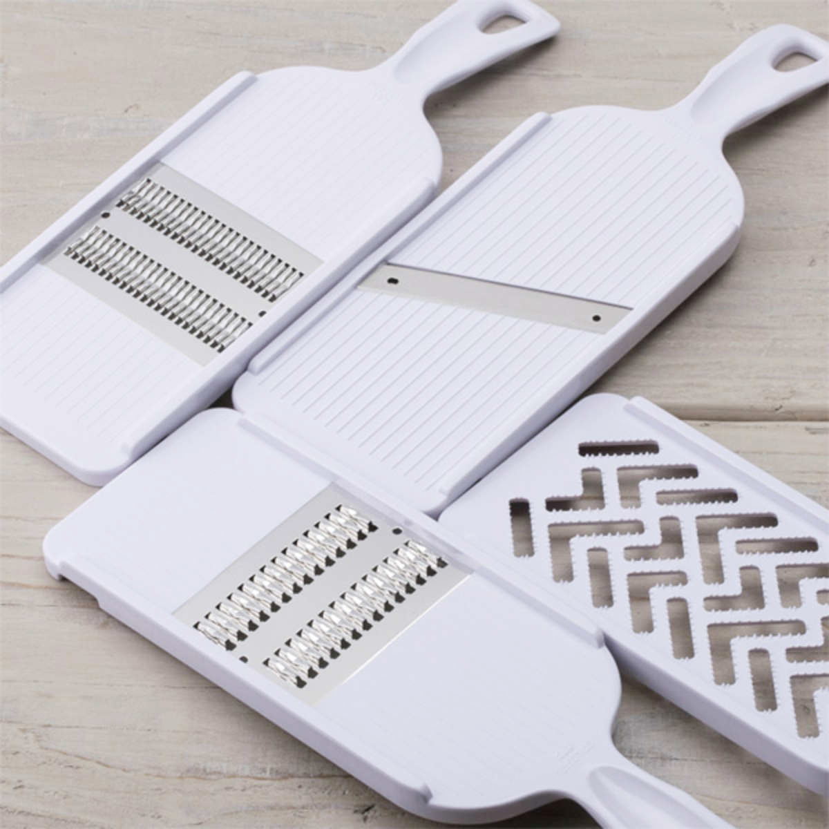 千切り器2種類、スライサー1個、おろし器1個、指ガードのセットです。