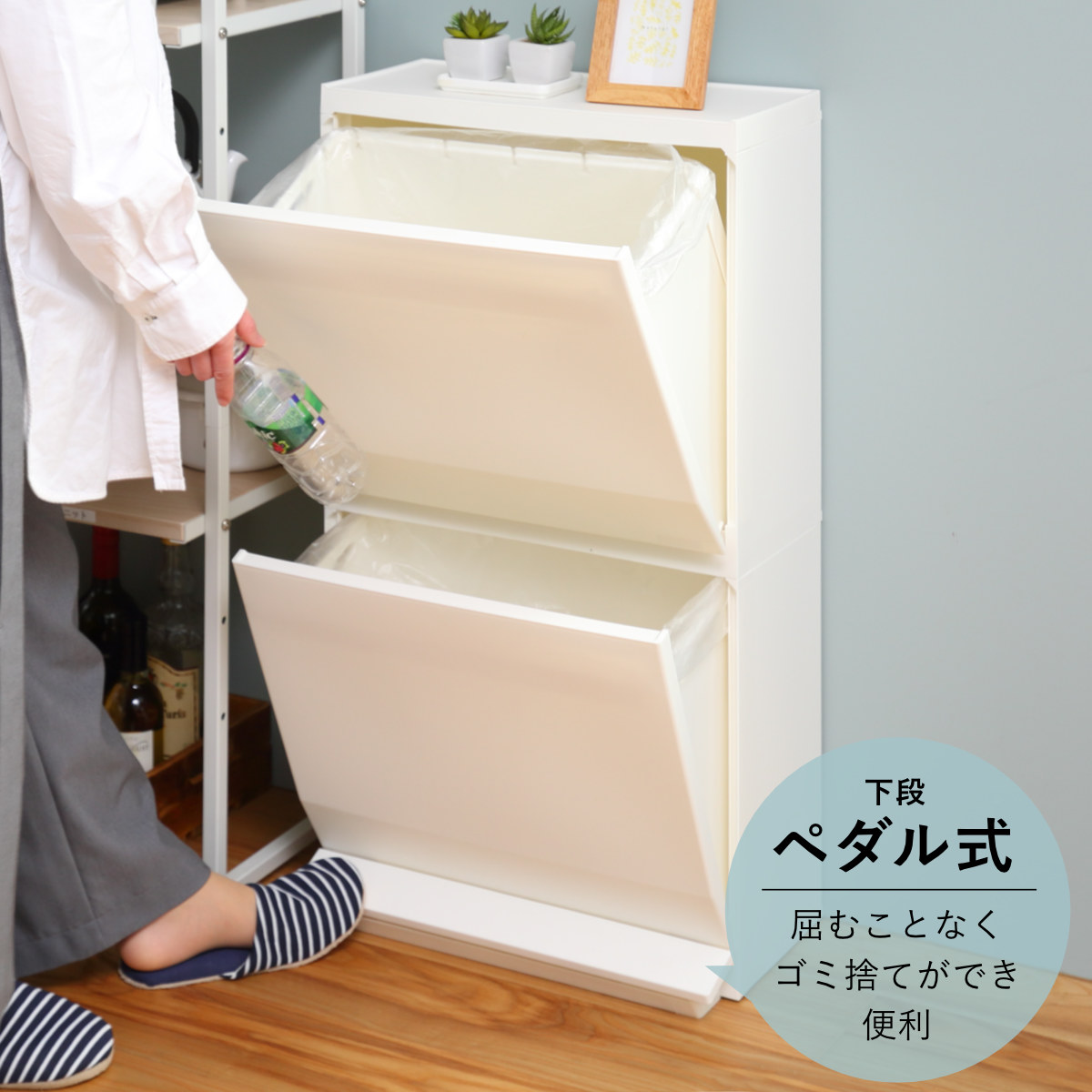 下段はペダル式なのでかがまず開閉できます。上下段ともに開いたまま固定できるので、手が離せない料理中のゴミ捨てや、袋の交換もスムーズにできます。