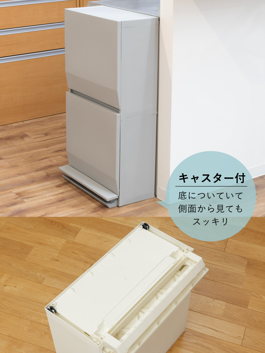 キャスターが見えにくい設計でデザインを損ないません。ゴミで重くなってもスイスイと動かせるので、掃除機がけや袋の交換時もラクラクです。