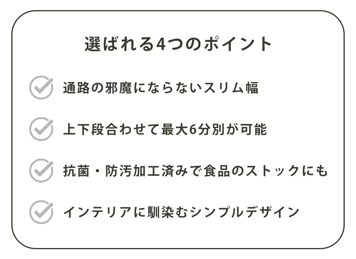 2段分別ストッカーは高さ85cm。これは一般的なキッチンカウンターと同じ高さです。高さが揃うと使い心地も各段にアップします。