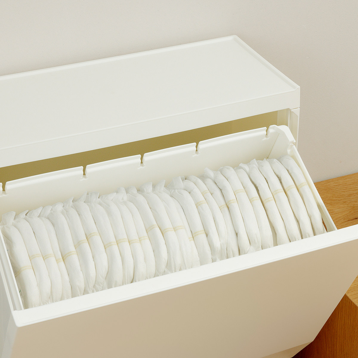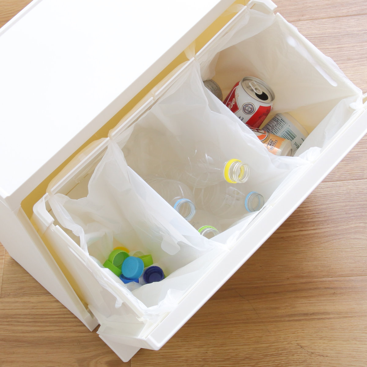 袋の持ち手が掛けられるスリット付きです。ボックス内に複数の袋を設置することで細かく分別できます。