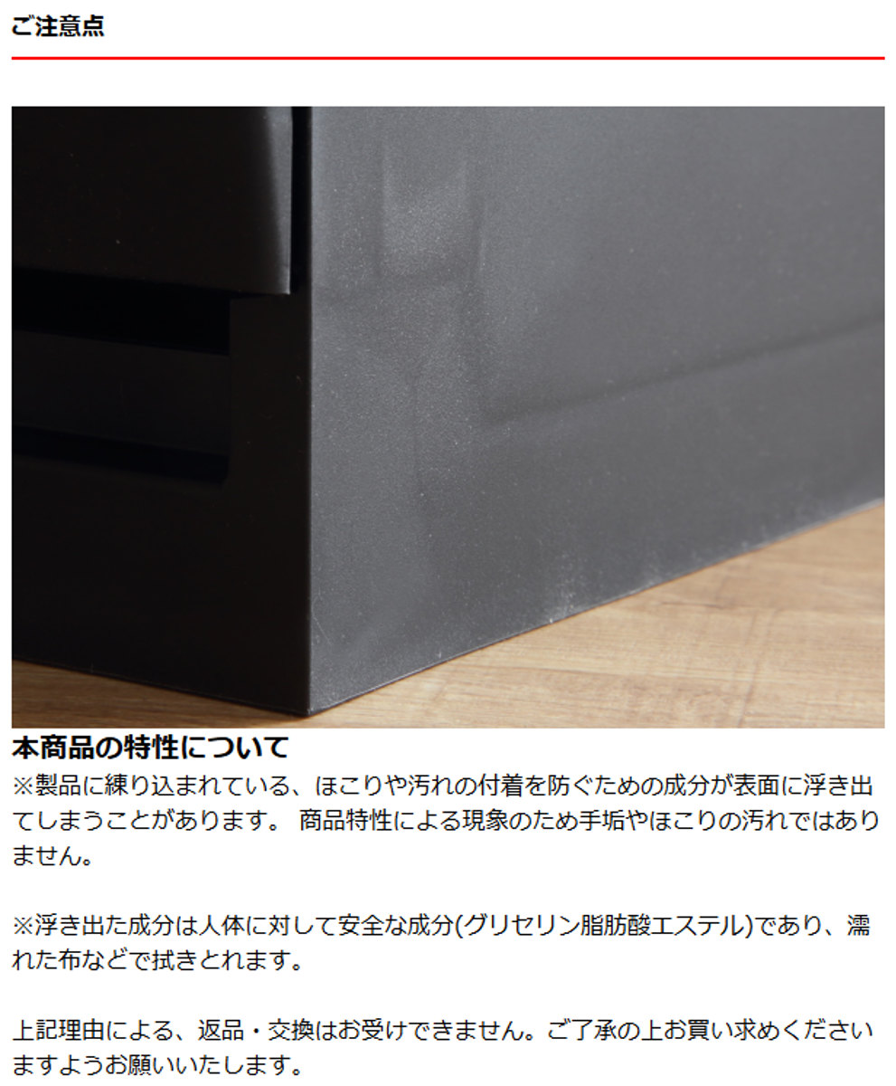 ※製品に練り込まれている、ほこりや汚れの付着を防ぐための成分が表面に浮き出てしまうことがあります。商品特性による現象のため手垢やほこりの汚れではありません。