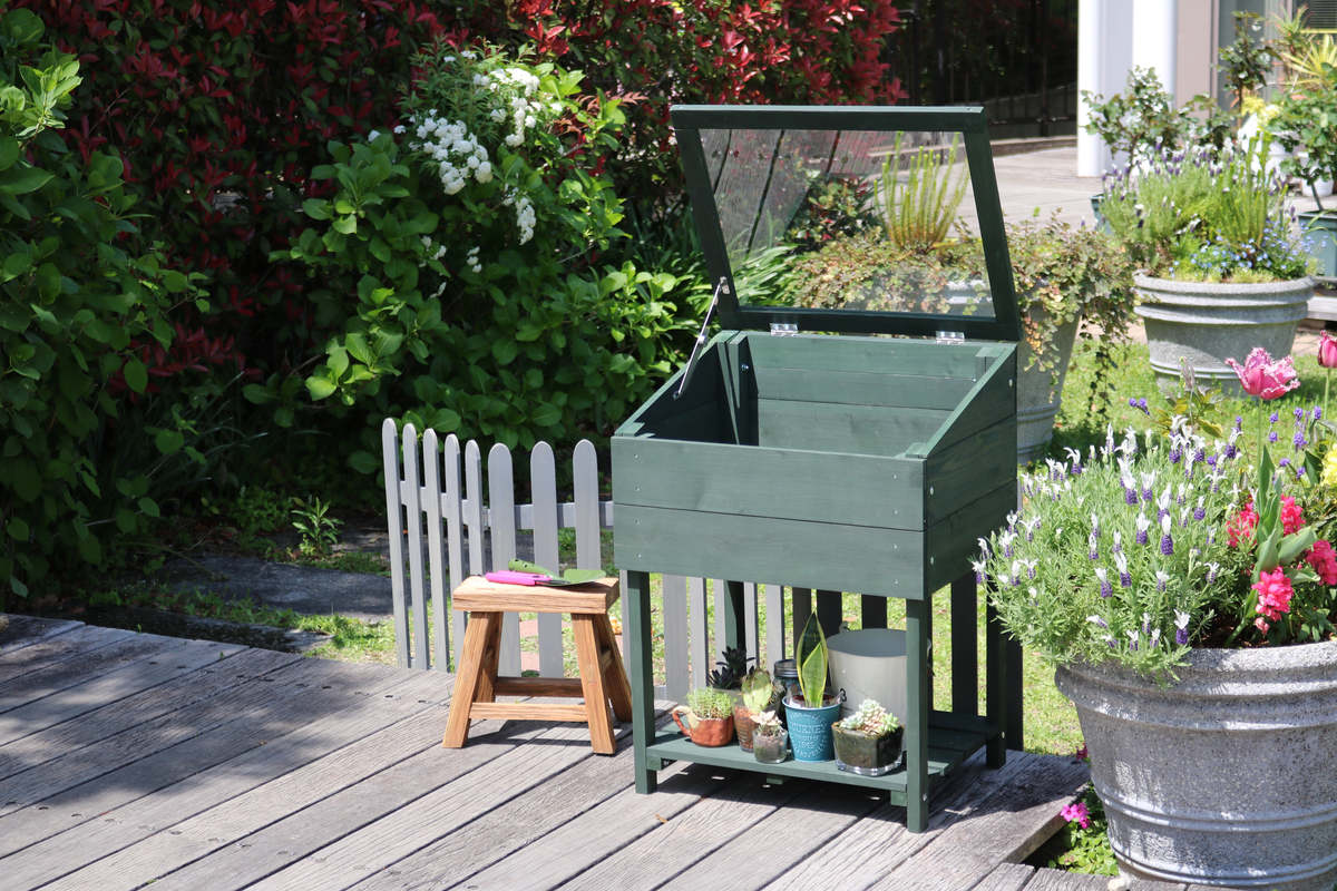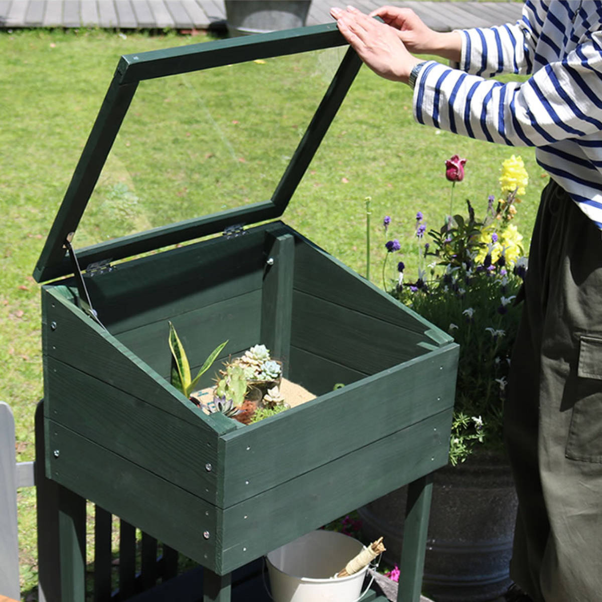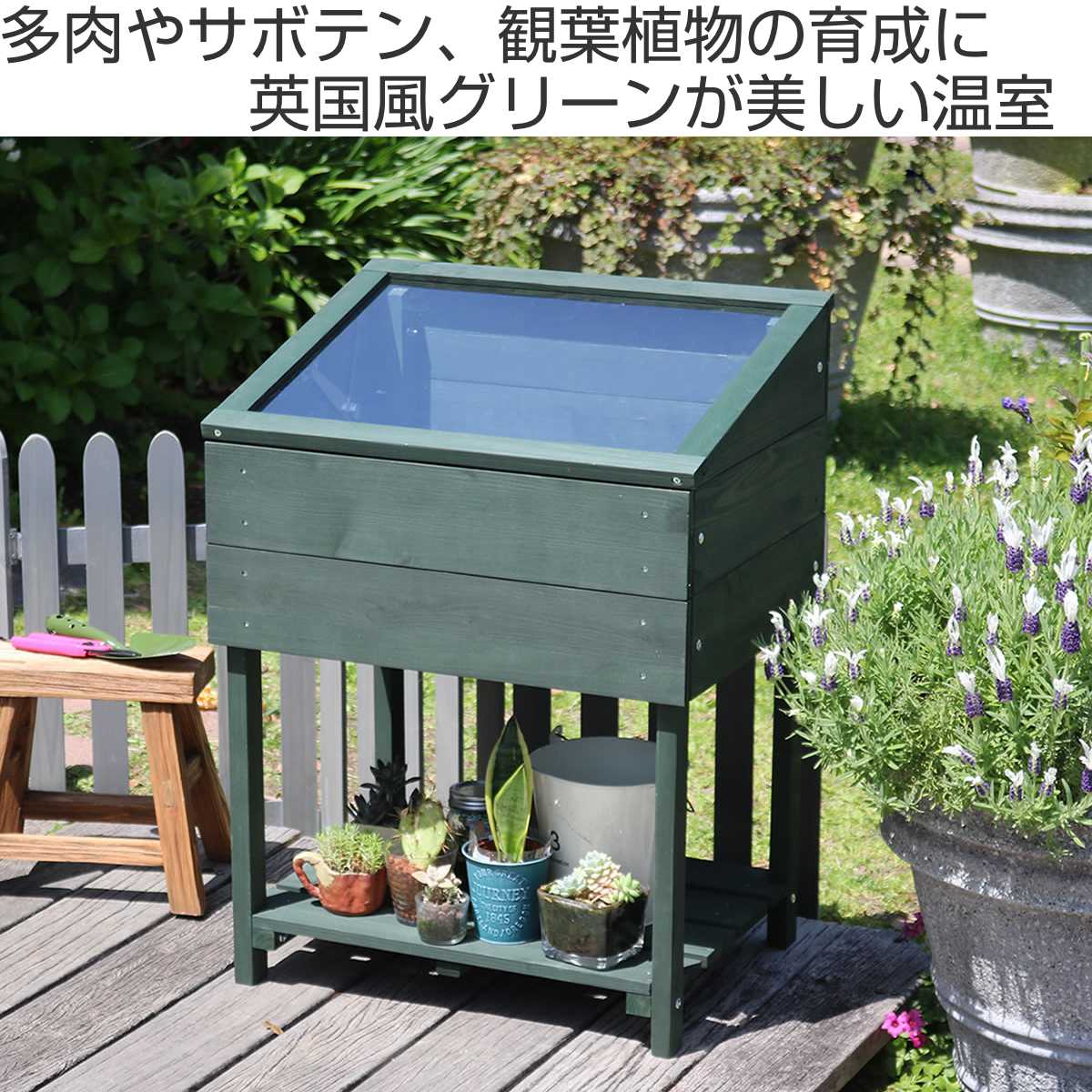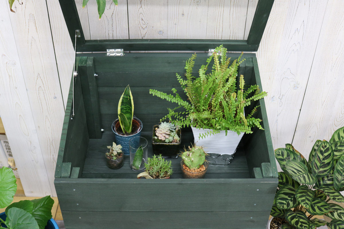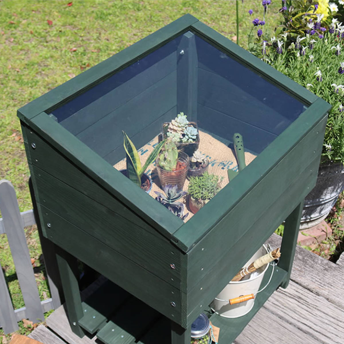コレクションケースのようなおしゃれなデザインと、英国風グリーンが美しい木製のグリーンハウスです。アクリル窓から中の様子が見え、自宅にお花屋さんができたような楽しさがあります。温室として植物の保護だけでなく、ボタニカルラックとしても楽しめます。