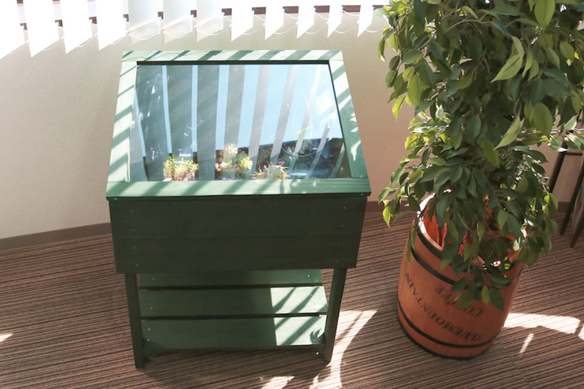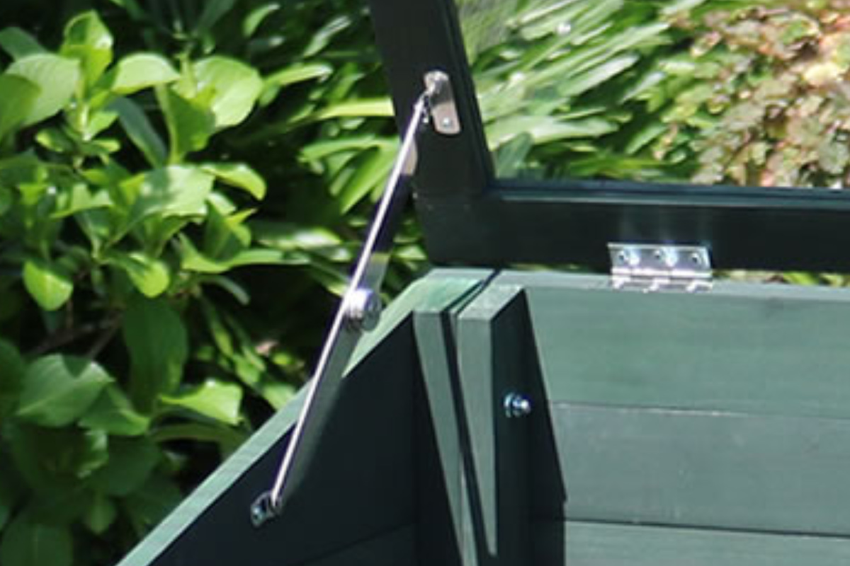 温室の開口部は傾斜があるので、見やすく作業がしやすいです。また、蓋はストッパー金具付きなので開けたまま固定できます。