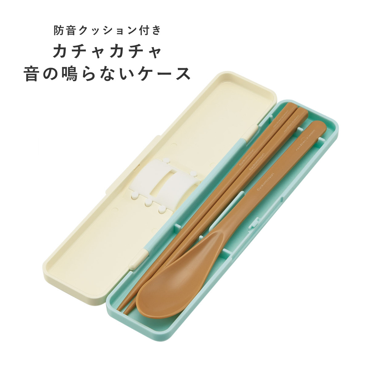カトラリーを持ち運ぶときに、ケースにあたってカチャカチャ音が鳴りにくいようにケースの中に防音クッションが付いています。クッションがスプーンとお箸をしっかり押さえ、上下左右に動かないので音が鳴りにくい仕様です。