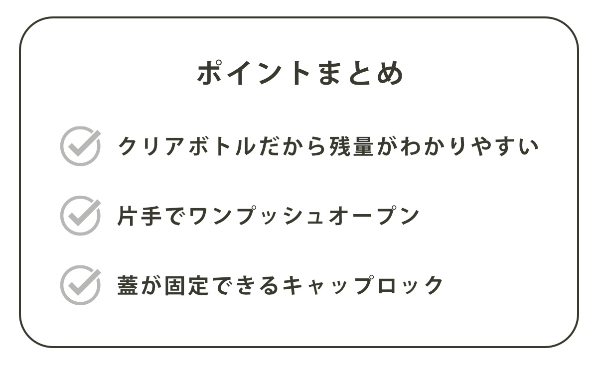| 材質 | 本体・キャップ:PET 蓋・ベルト:ポリプロピレン パッキン:シリコーンゴム バネ・ピン:ステンレス |