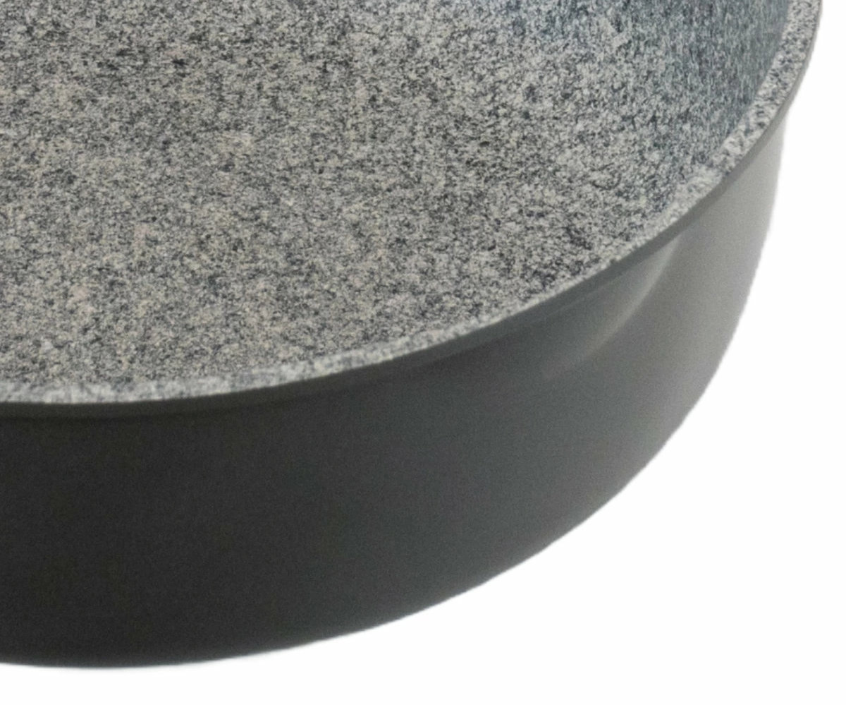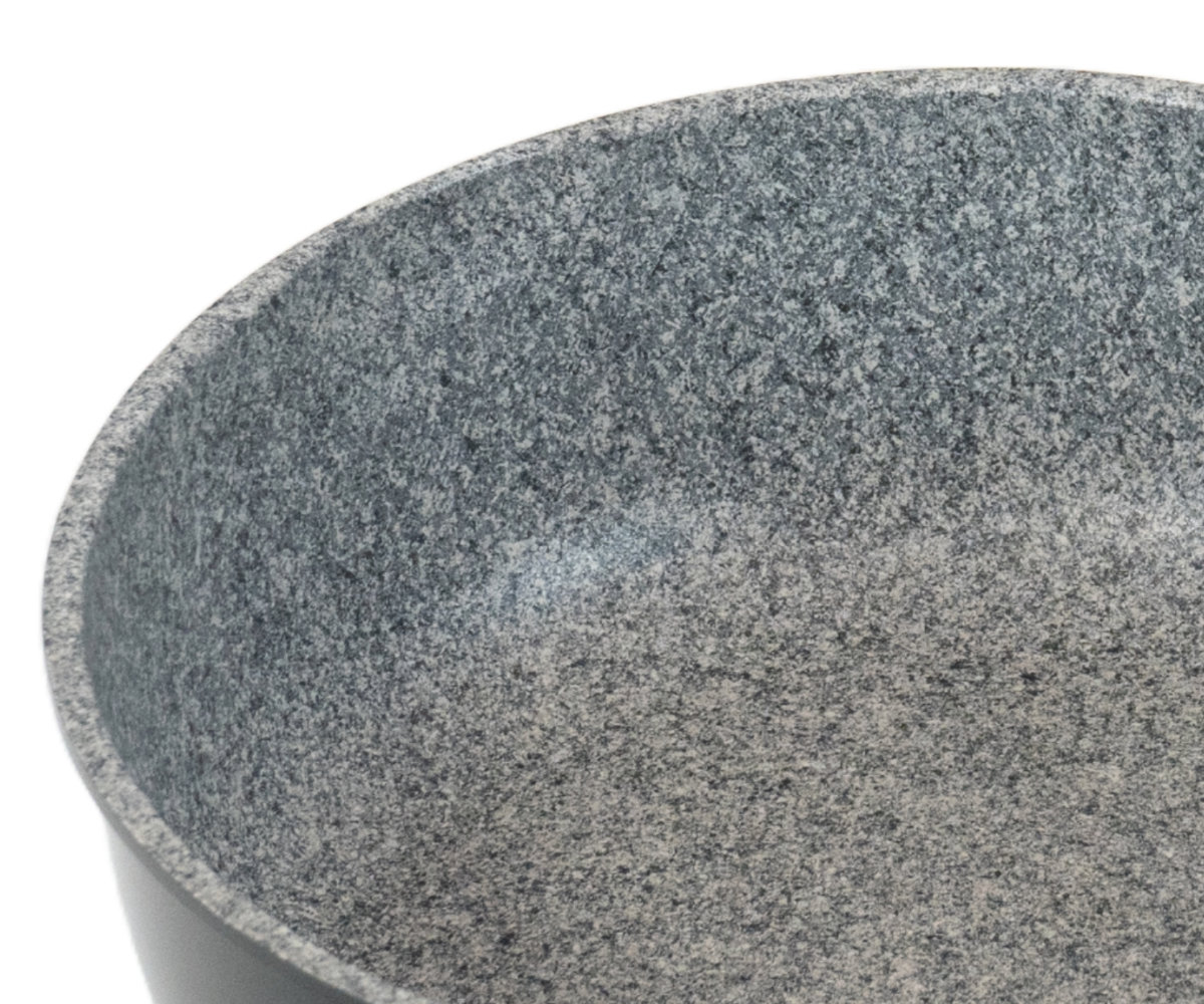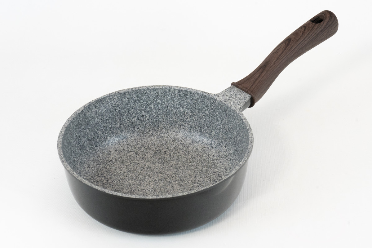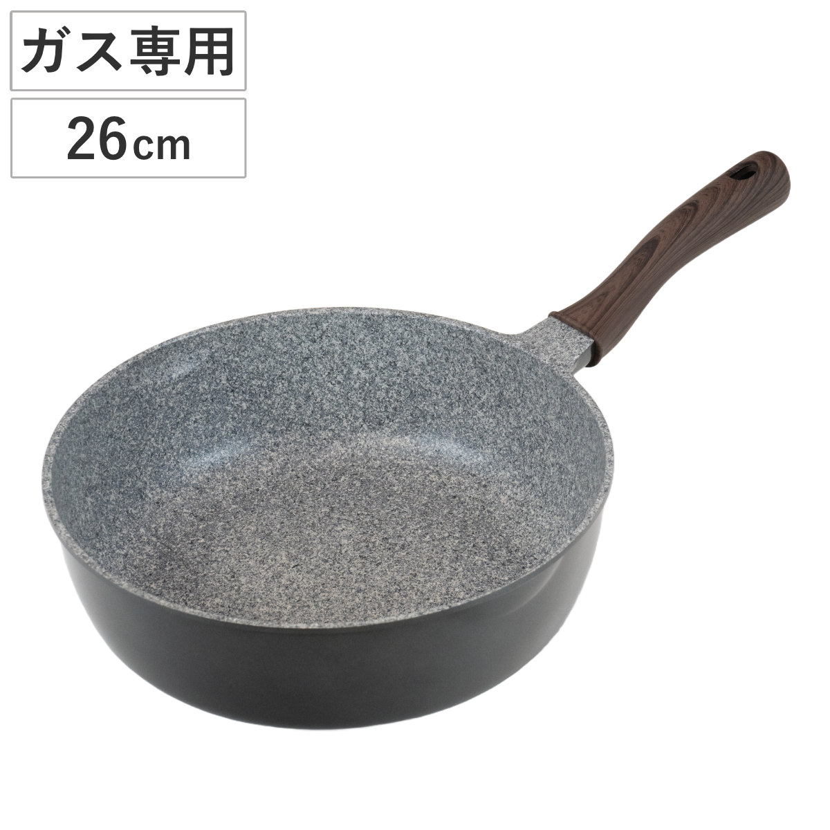 焼く、炒める、茹でる、煮る、揚げる、ができる、深型のフライパンです。内面はグレーのマーブル柄がシックで、ブラック×木目が落ち着いた雰囲気なので、そのまま食卓へ出してもお料理を引き立ててくれます。