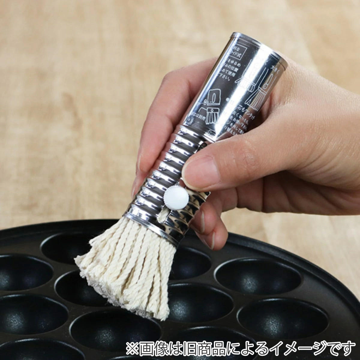 たこ焼器や鉄板に油を引くのに便利な油引です。鉄板には短め、たこ焼きの穴には長めと…用途に合わせて芯の長さが変えられます。
