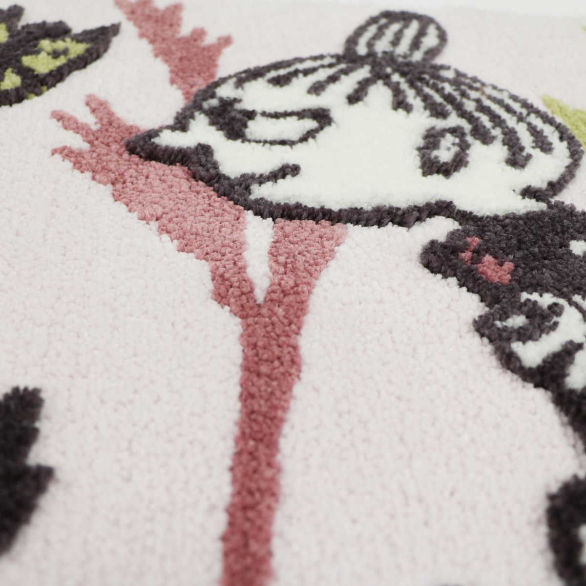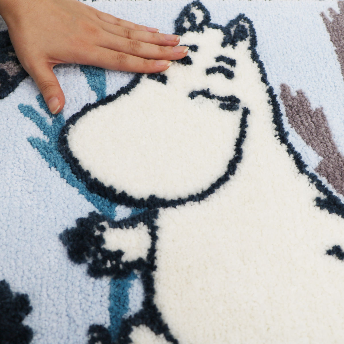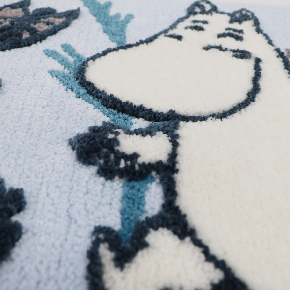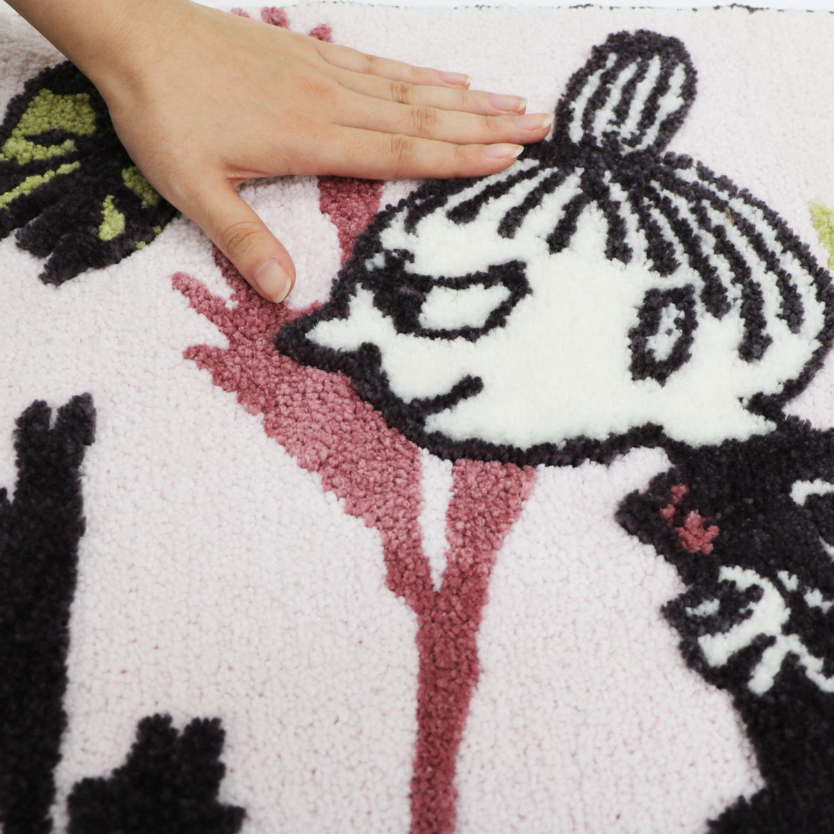 糸の材質や毛足の長さに変化をつけ、キャラクターを立体的に表現しています。肌触りも楽しめるマットです。