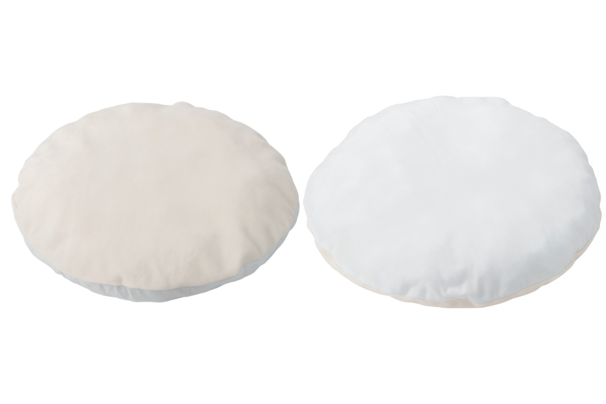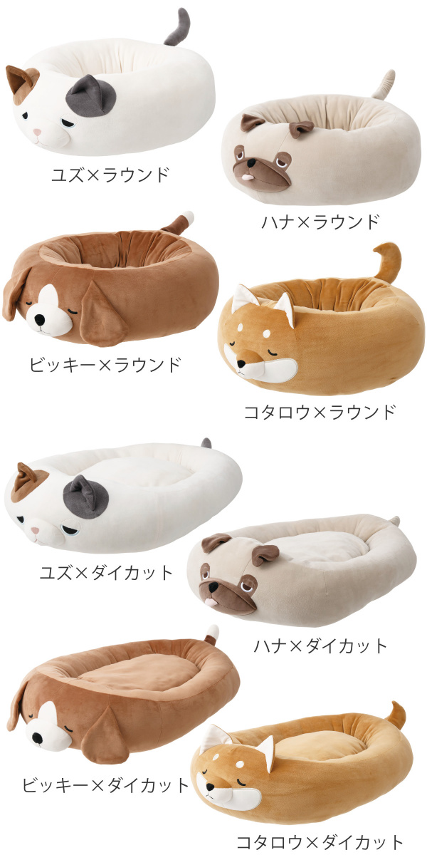 極上のふわもちクッションが程よく体にフィットし、包み込まれるような寝心地のペットベッドです。丸くなって眠りたいネコちゃんや小型のワンちゃんには、ぴったりフィットする【ラウンド型】がおすすめです。【ダイカット型】はワンちゃんがゆったり休めるサイズです。