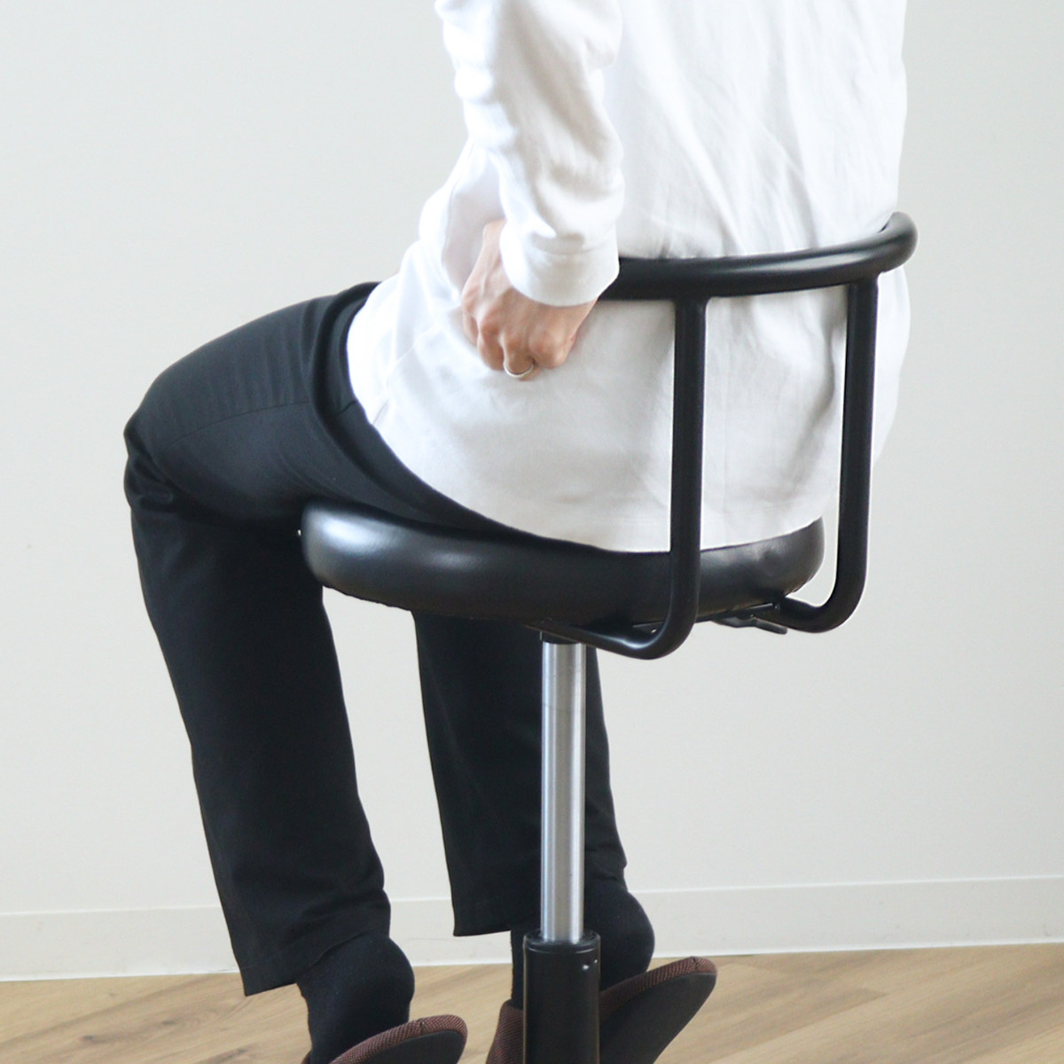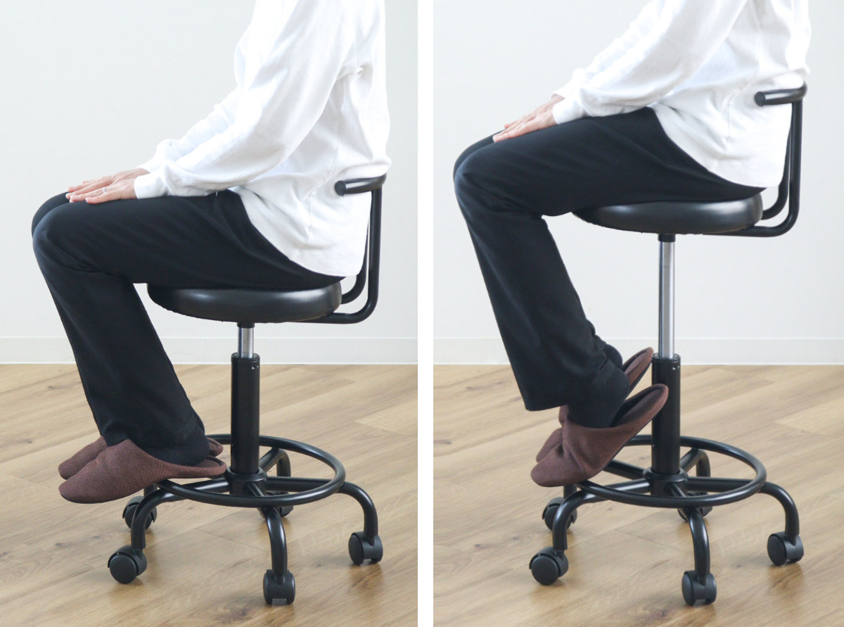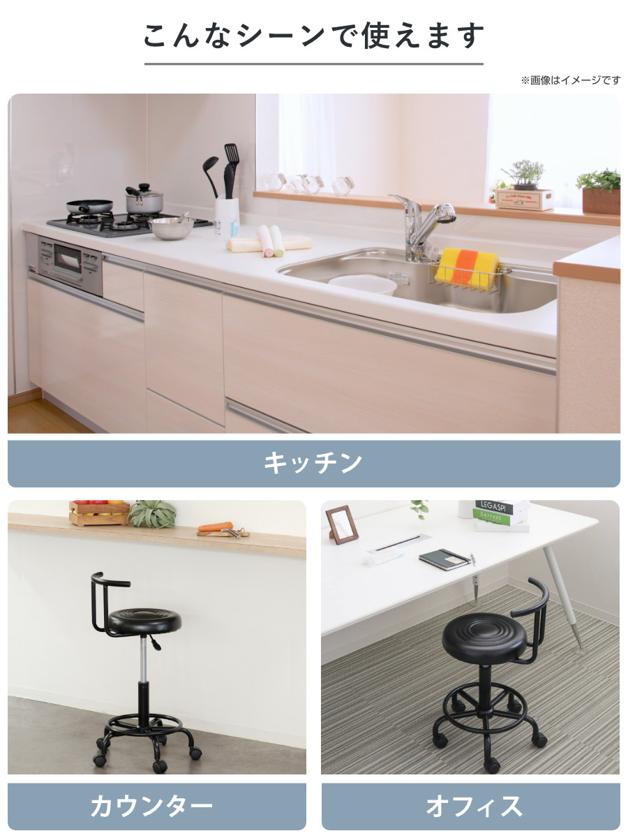 リングの足置き場は座面を高くした時に足を乗せることができ、疲労の軽減につながります。また、5つのキャスター付きで安定感があり前後左右ラクに移動できます。デスク前やキッチンまわりでの作業椅子としても便利にお使いいただけます。
