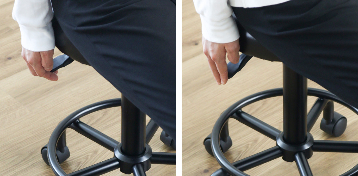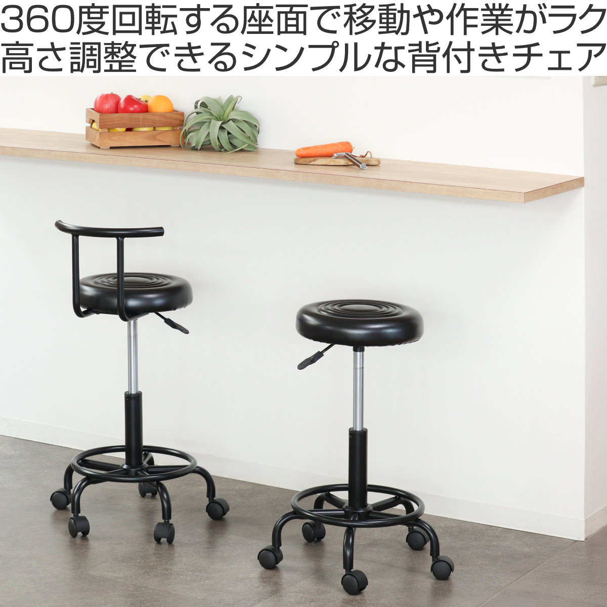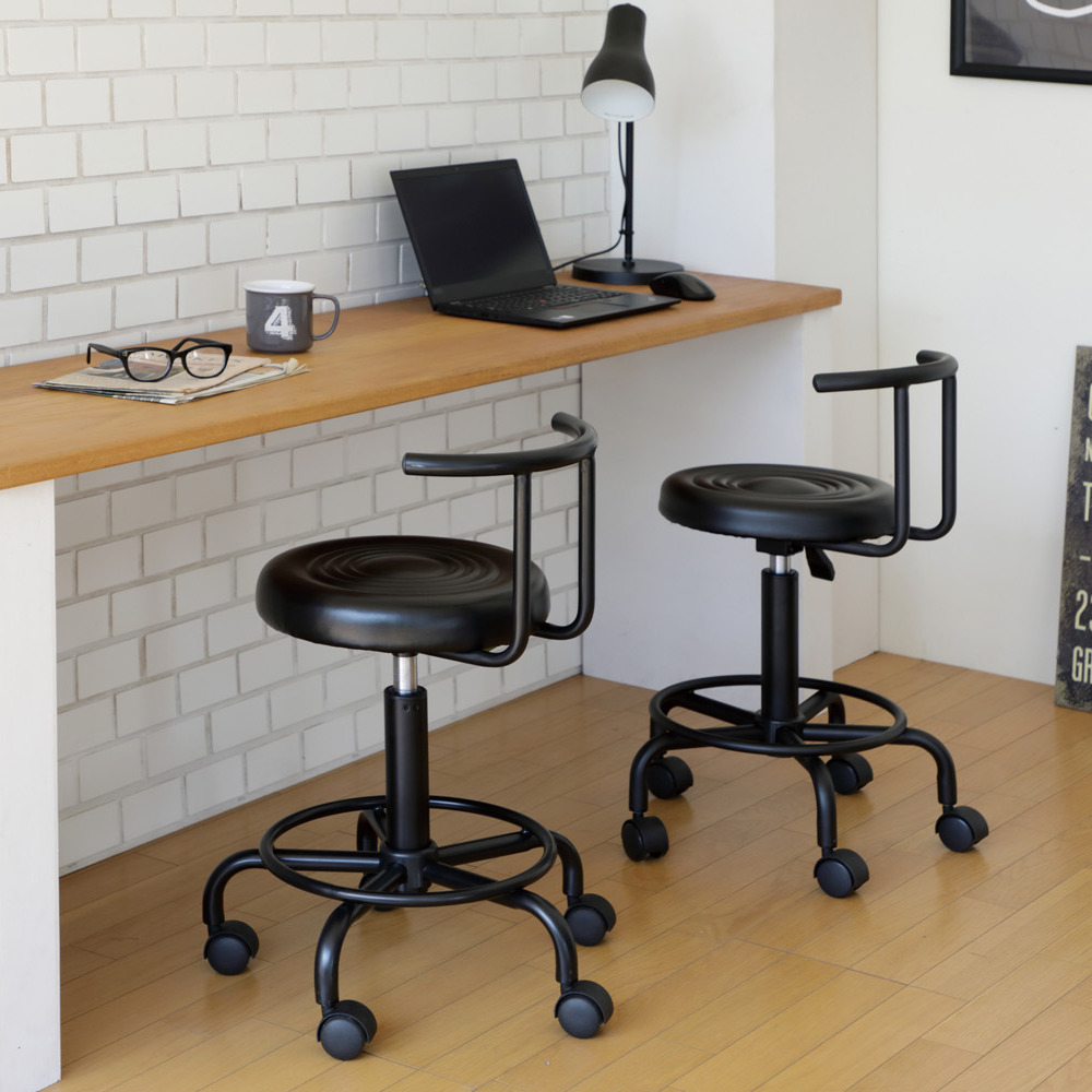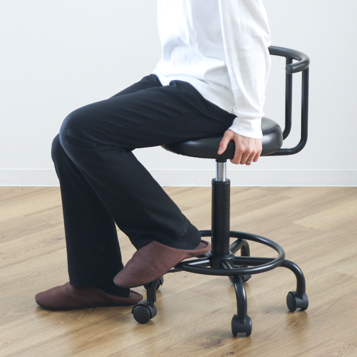 リングの足置き場は座面を高くした時に足を乗せることができ、疲労の軽減につながります。また、5つのキャスター付きで安定感があり前後左右ラクに移動できます。デスク前やキッチンまわりでの作業椅子としても便利にお使いいただけます。