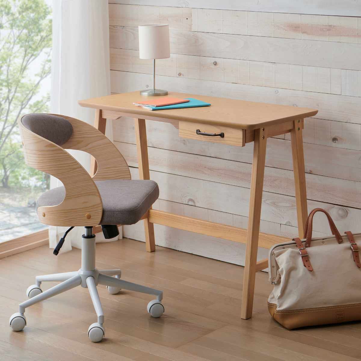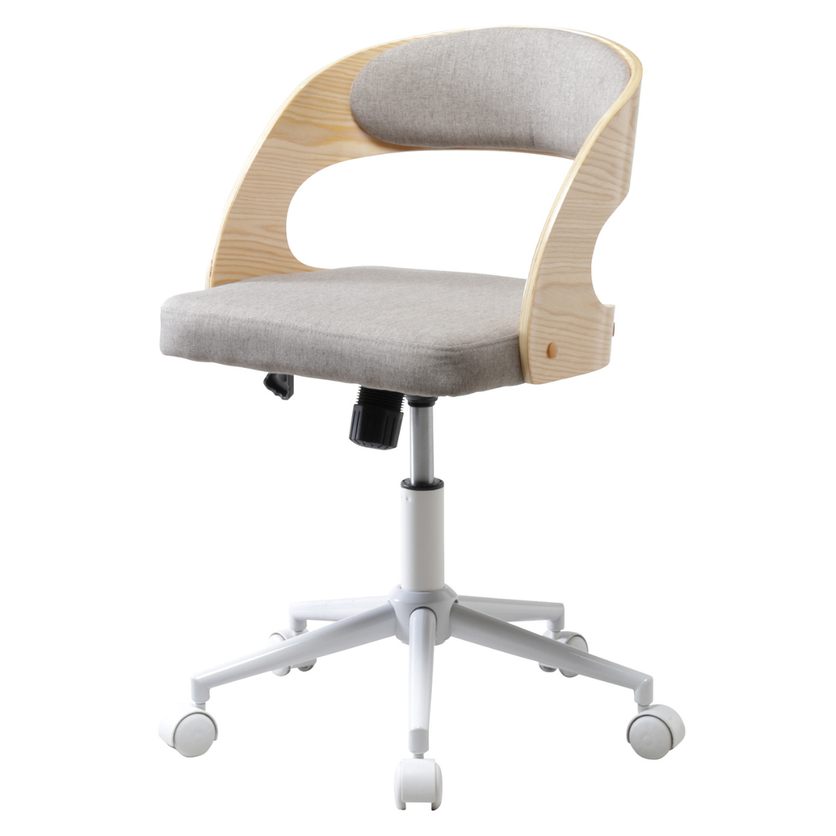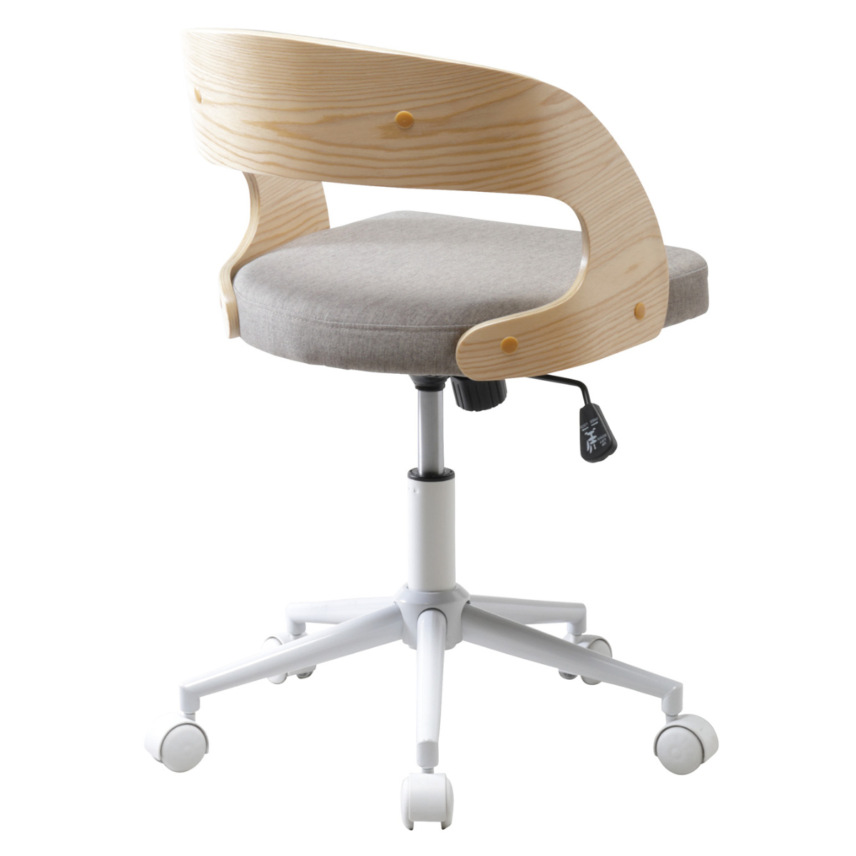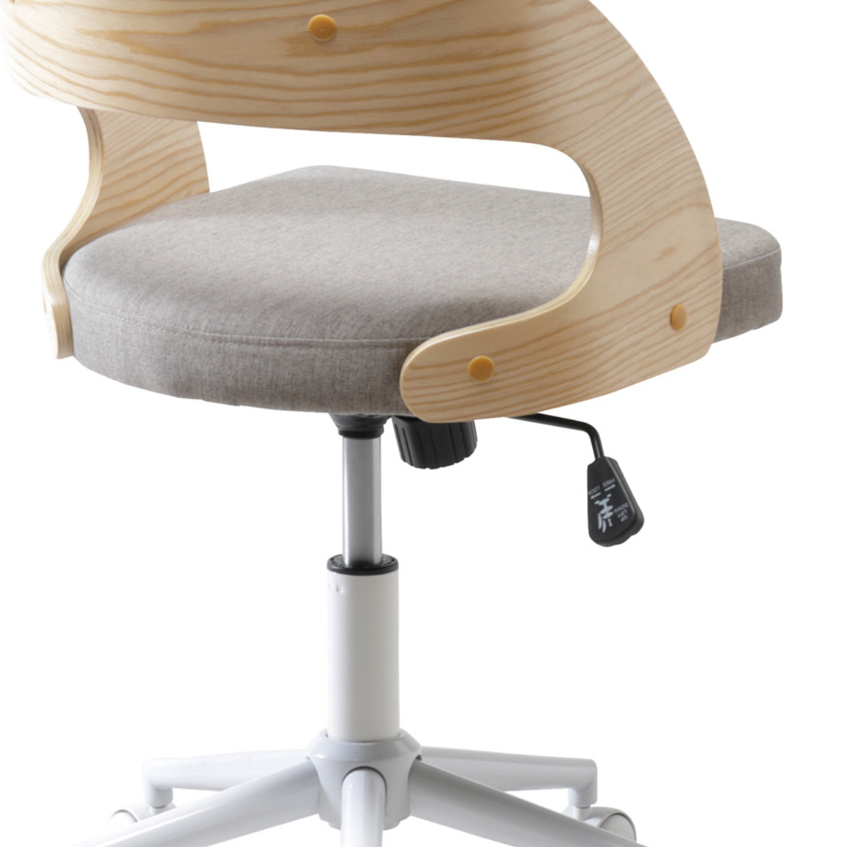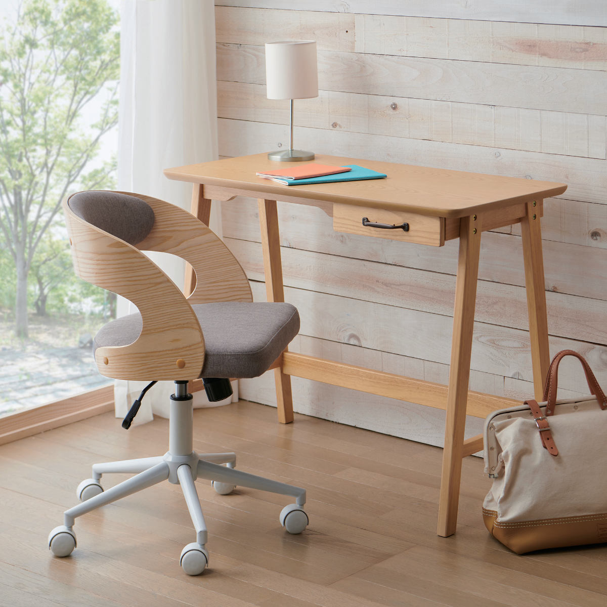 自宅でのワークシーンに馴染んでくれる昇降式のデスクチェアです。個性あるフォルムの合板の背にカジュアルなファブリックを使用しています。シンプルなデザインのため、どのようなシーンにも合わせやすいです。