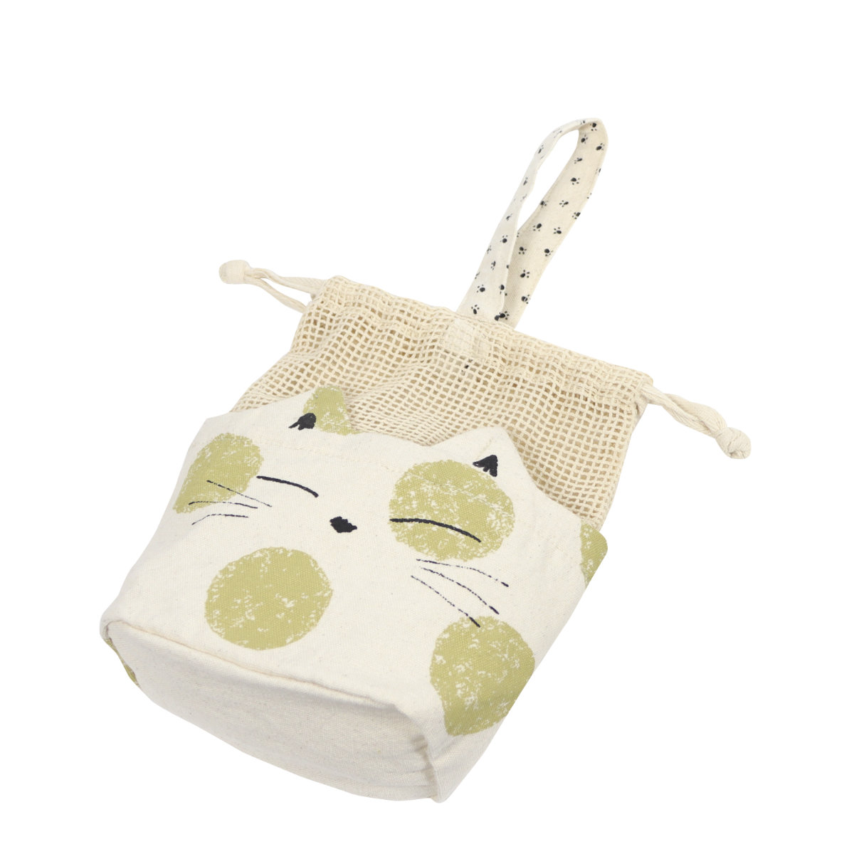 可愛い配色の柄に、耳を付けてネコの顔をプリントした楽しいデザインの巾着型ポーチです。持っているだけでコーディネートの主役になってくれる存在感抜群のバッグです。天然素材を使用ししたハンドメイド製品のため、ナチュラルな風合いを楽しめます。