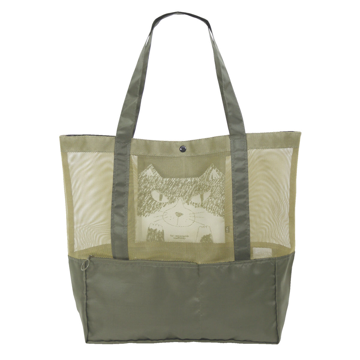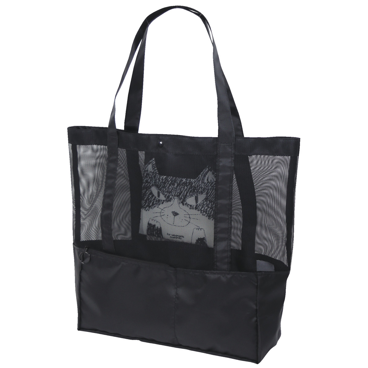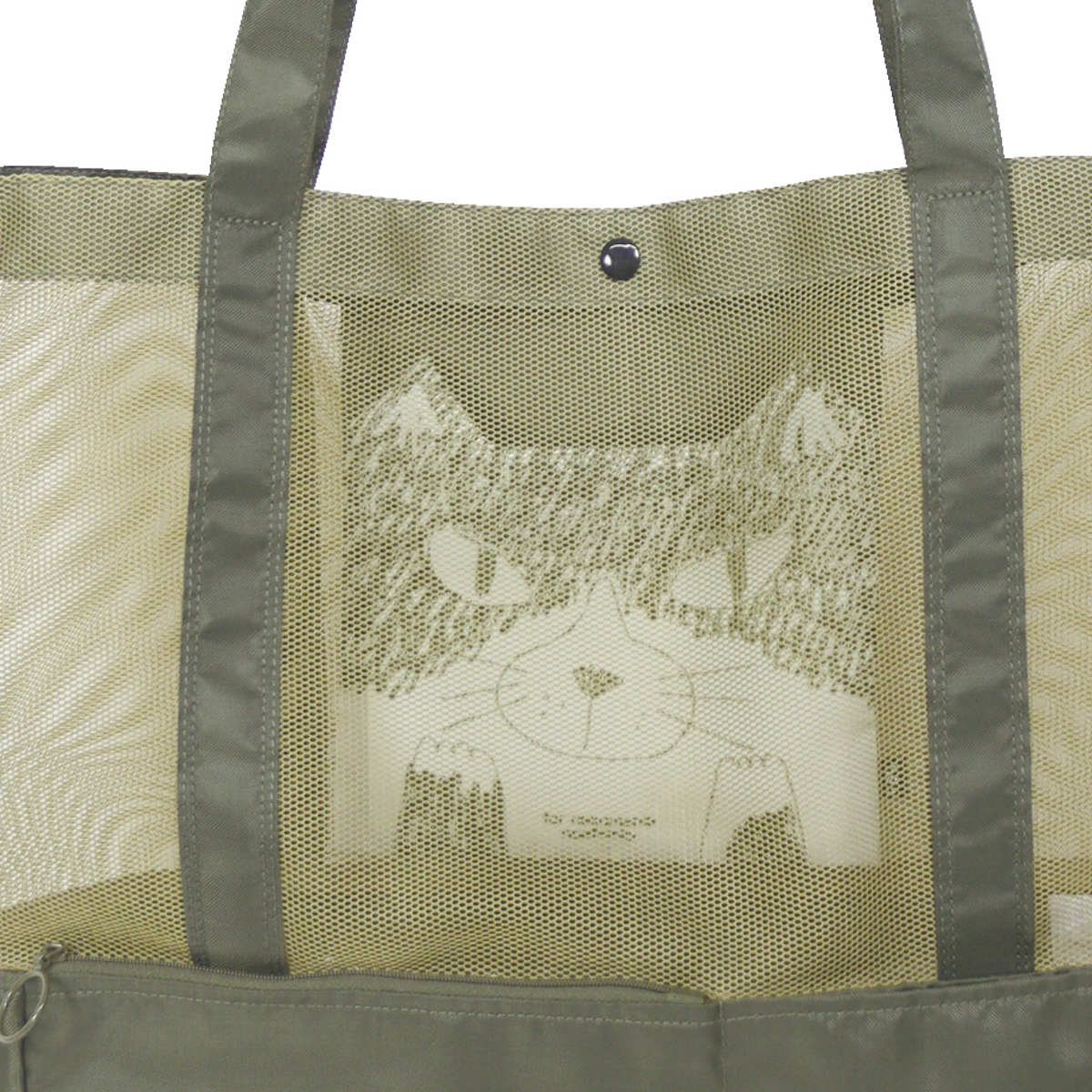 程よくシースルーなメッシュ素材がお洒落なデザイン。内ポケットにデザインされたネコの「ハチ」くんがバッグの中から見守ってくれています。いつでも一緒にお買い物をしているようで楽しくなります。