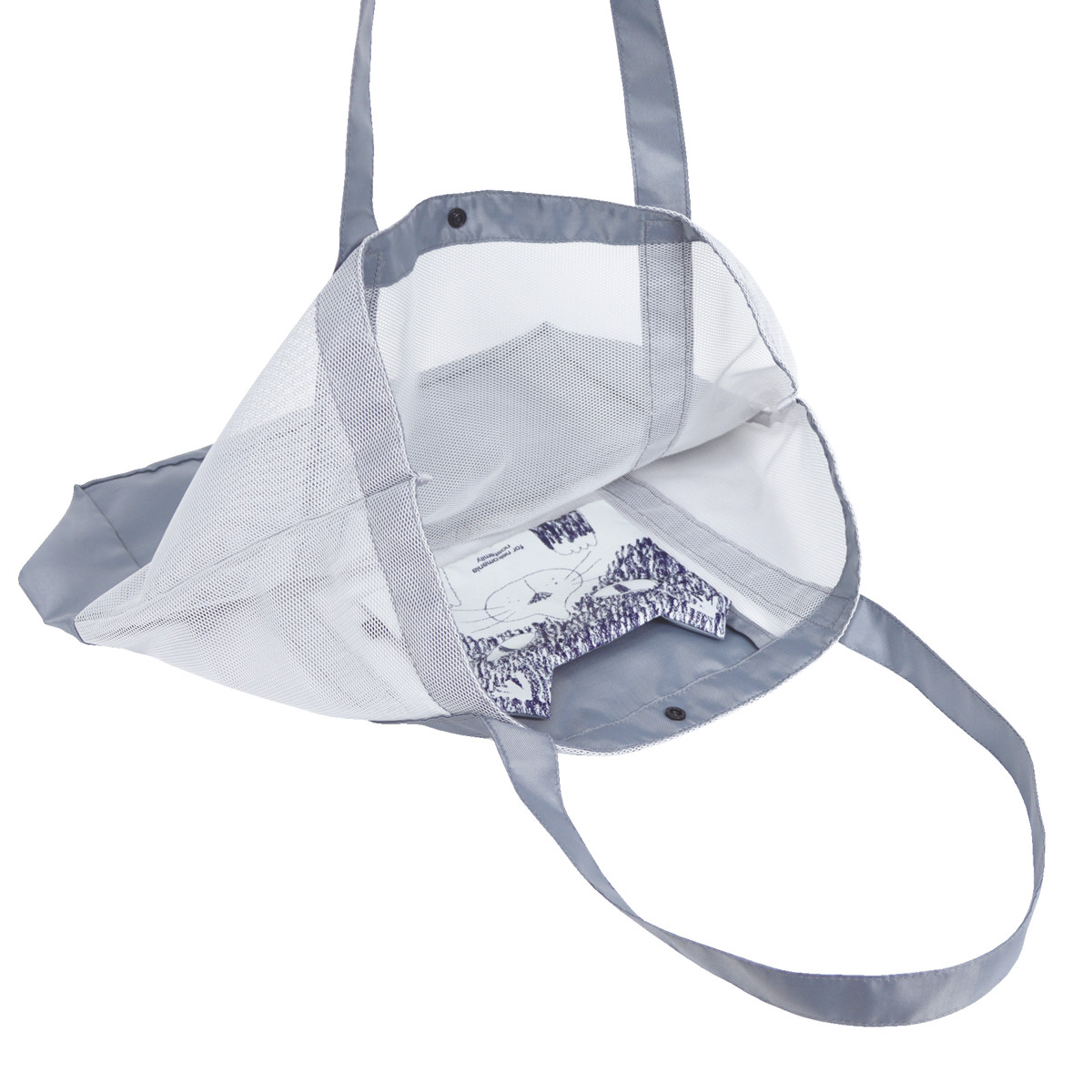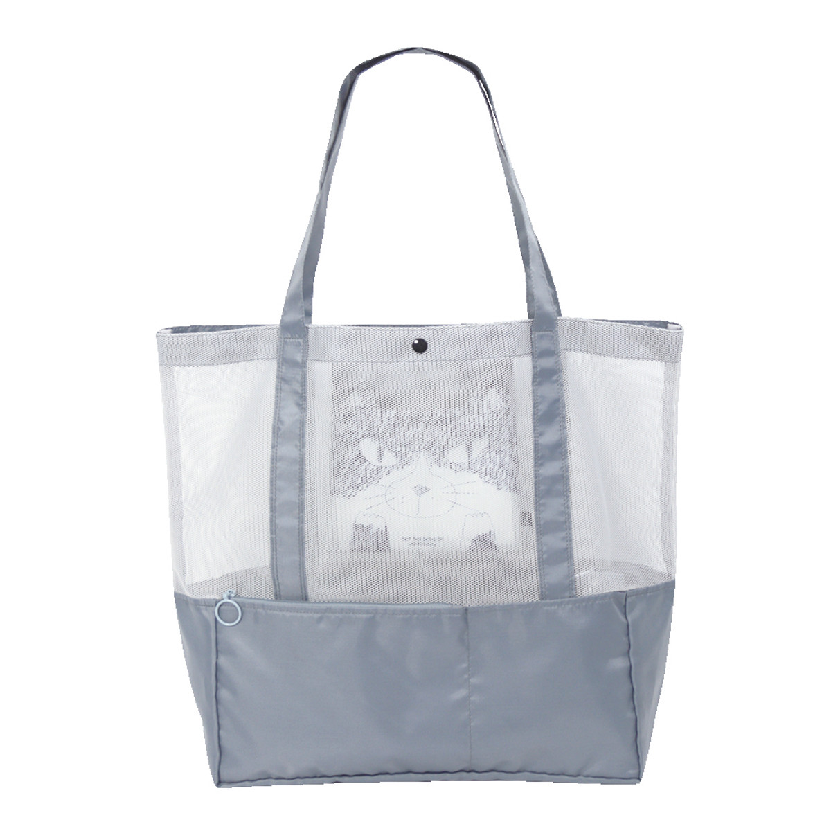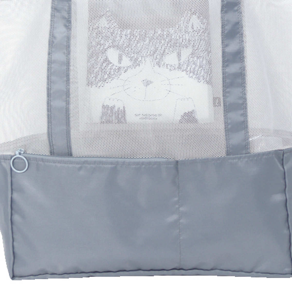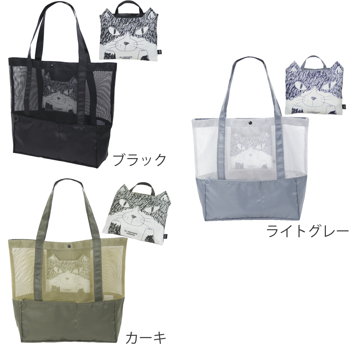 程よくシースルーなメッシュ素材がお洒落なデザイン。内ポケットにデザインされたネコの「ハチ」くんがバッグの中から見守ってくれています。いつでも一緒にお買い物をしているようで楽しくなります。