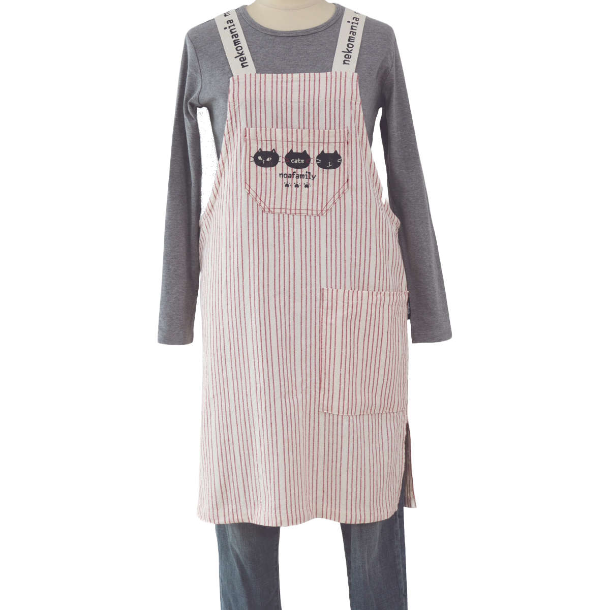 着脱も楽ちん、ポケット部分のネコのプリントが可愛いエプロン