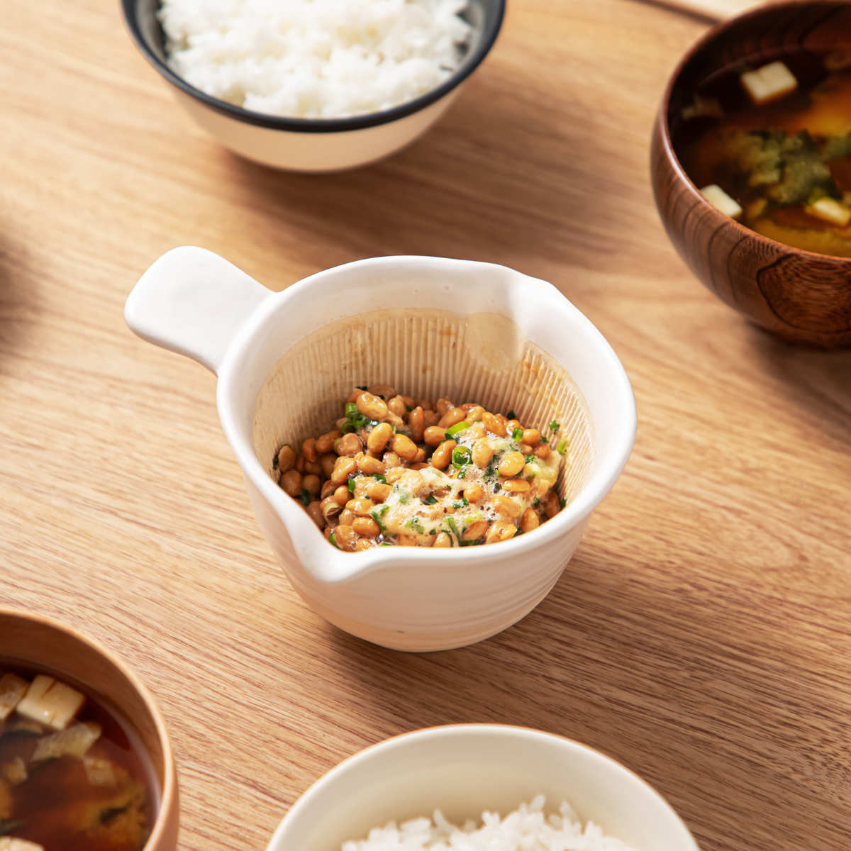 納豆だけではなく、溶き卵を作る際の器としてもお使いいただけます。取っ手と注ぎ口付きだから料理にも使いやすいです。