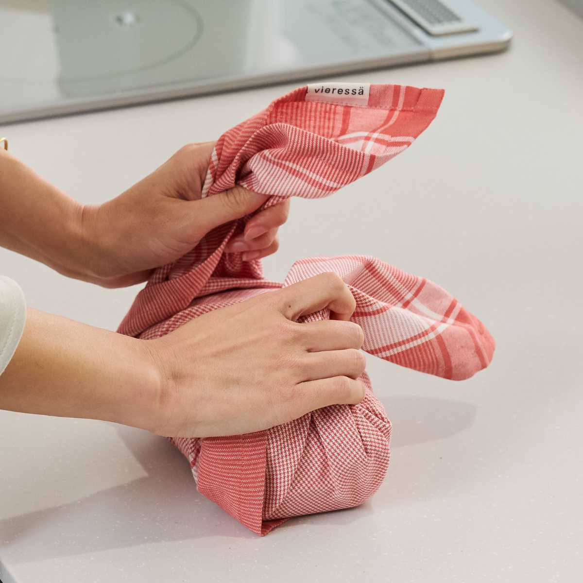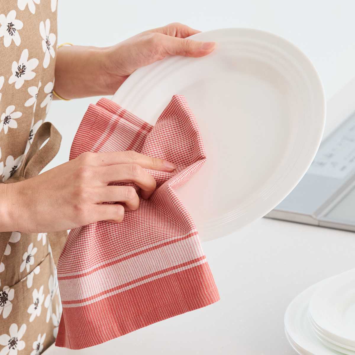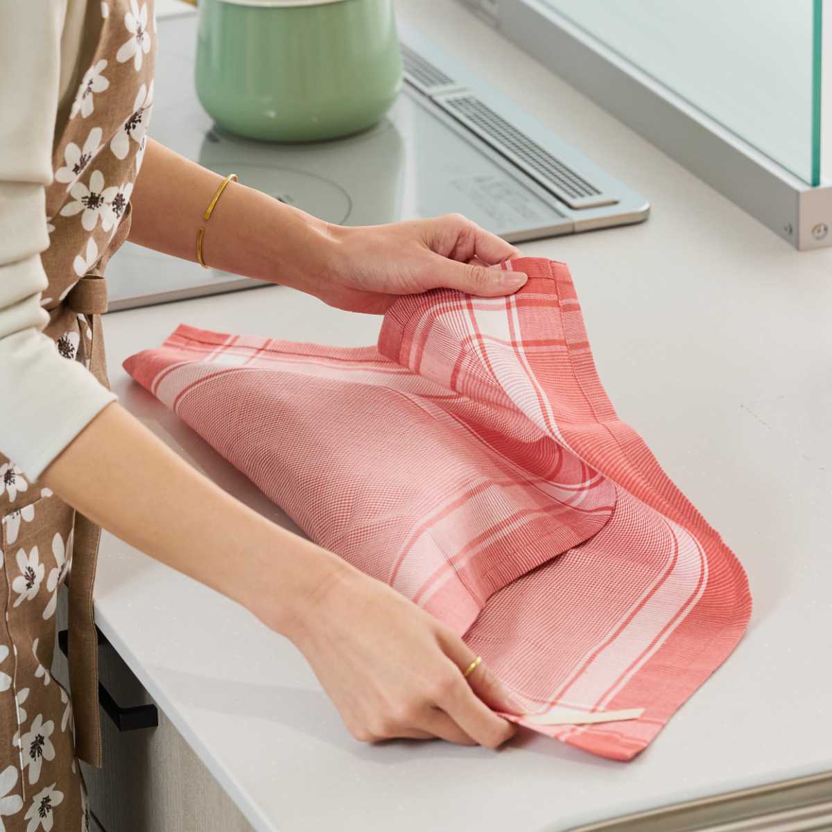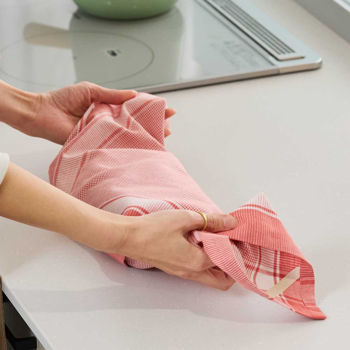 キッチンクロスとしてはもちろん、ランチョンマットやお弁当を包むランチクロスなど、様々なシーンでご使用いただけます。フックに掛けられるループ付きです。