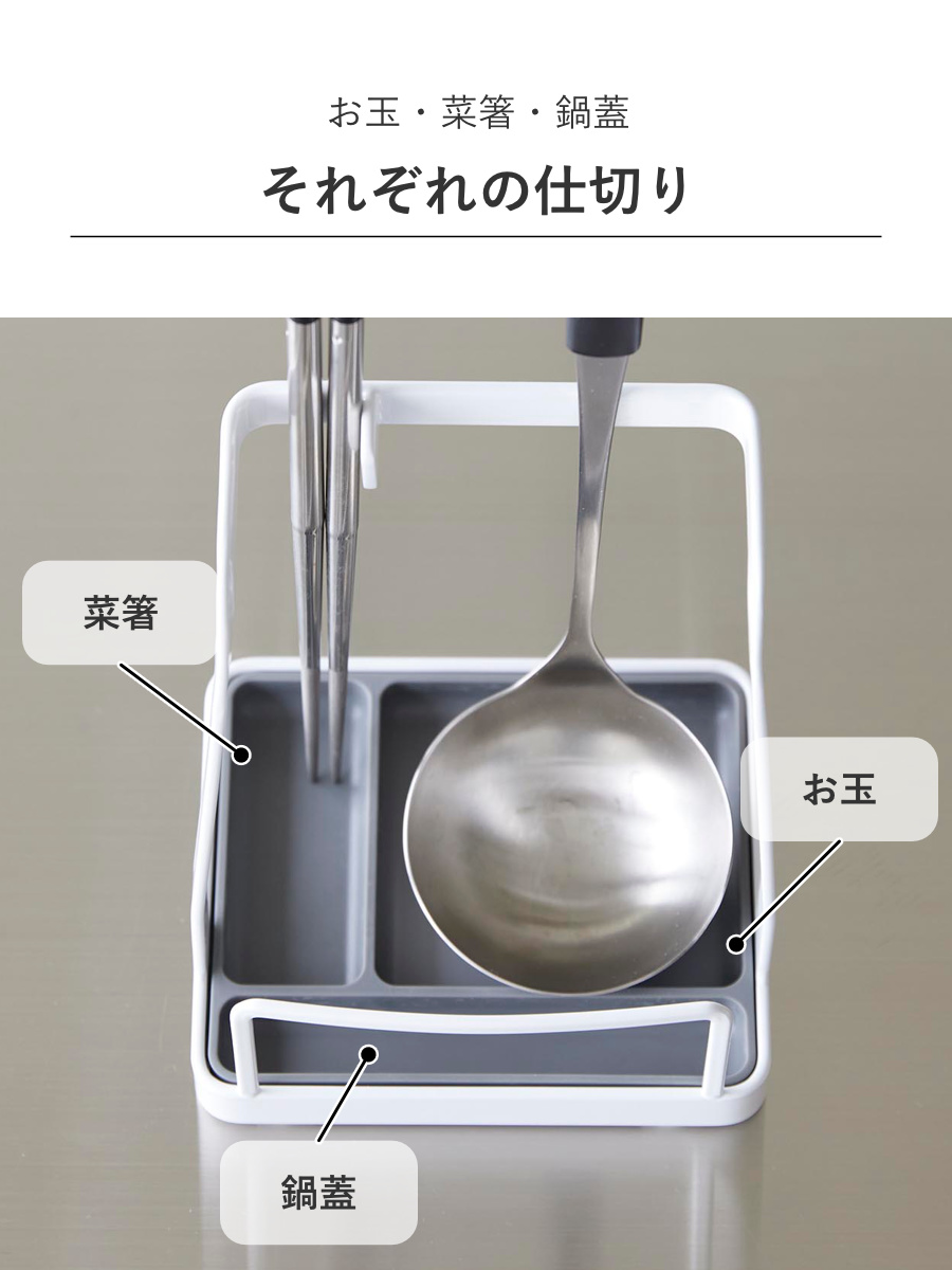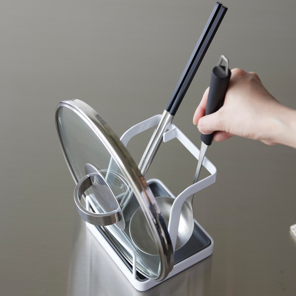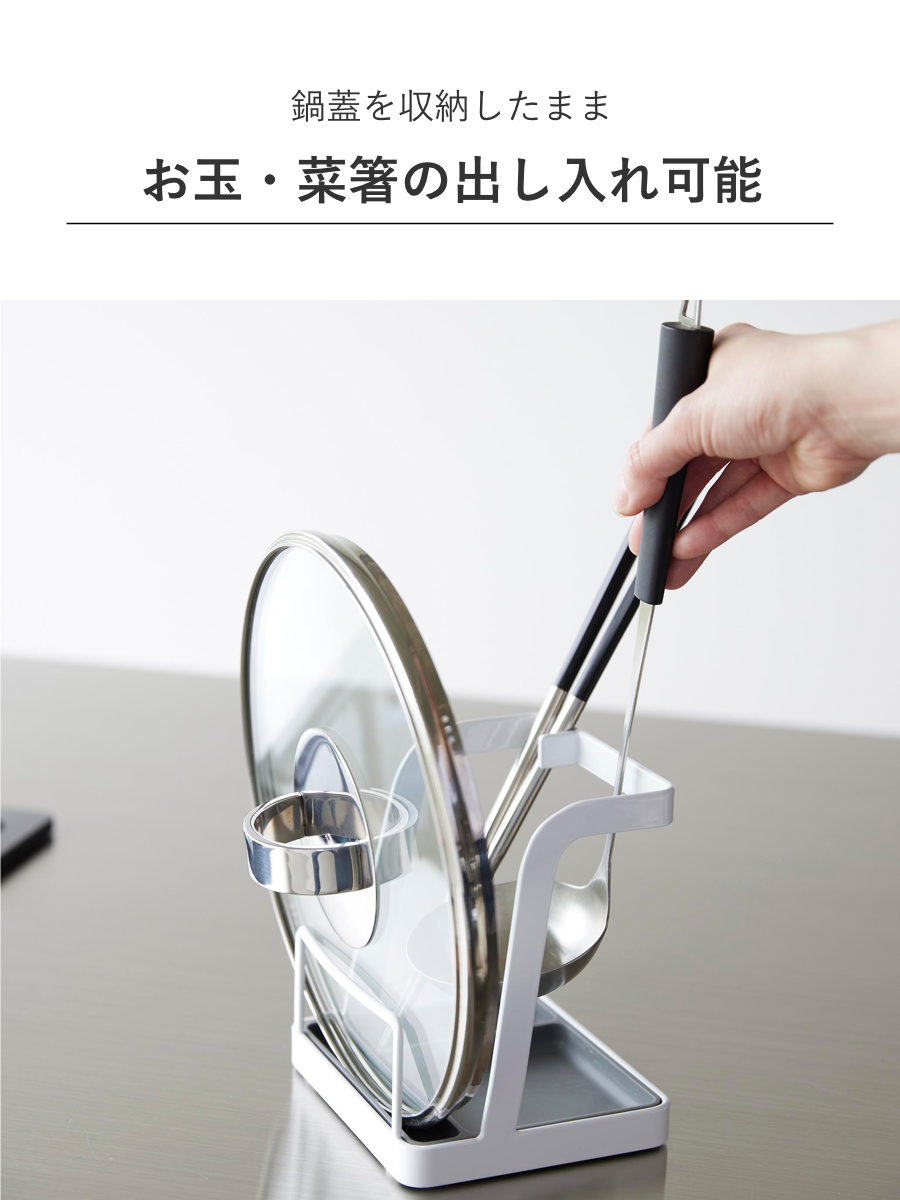 鍋蓋を収納したままお玉・菜箸の出し入れができます。いちいちどかしたりずらしたりする必要がないので、調理中に使いたいものをさっと手に取れます。