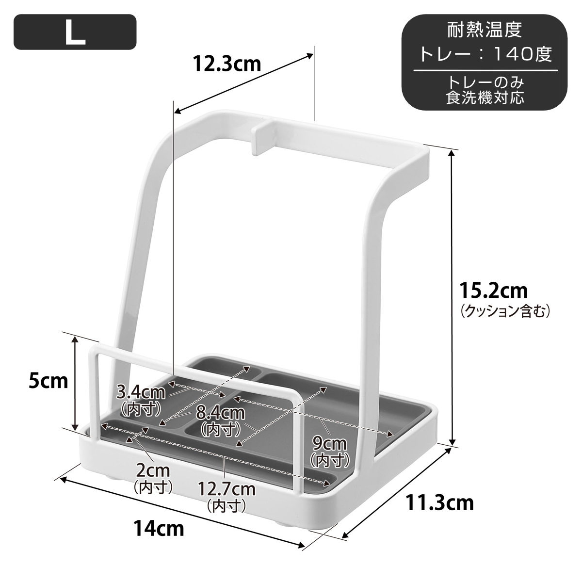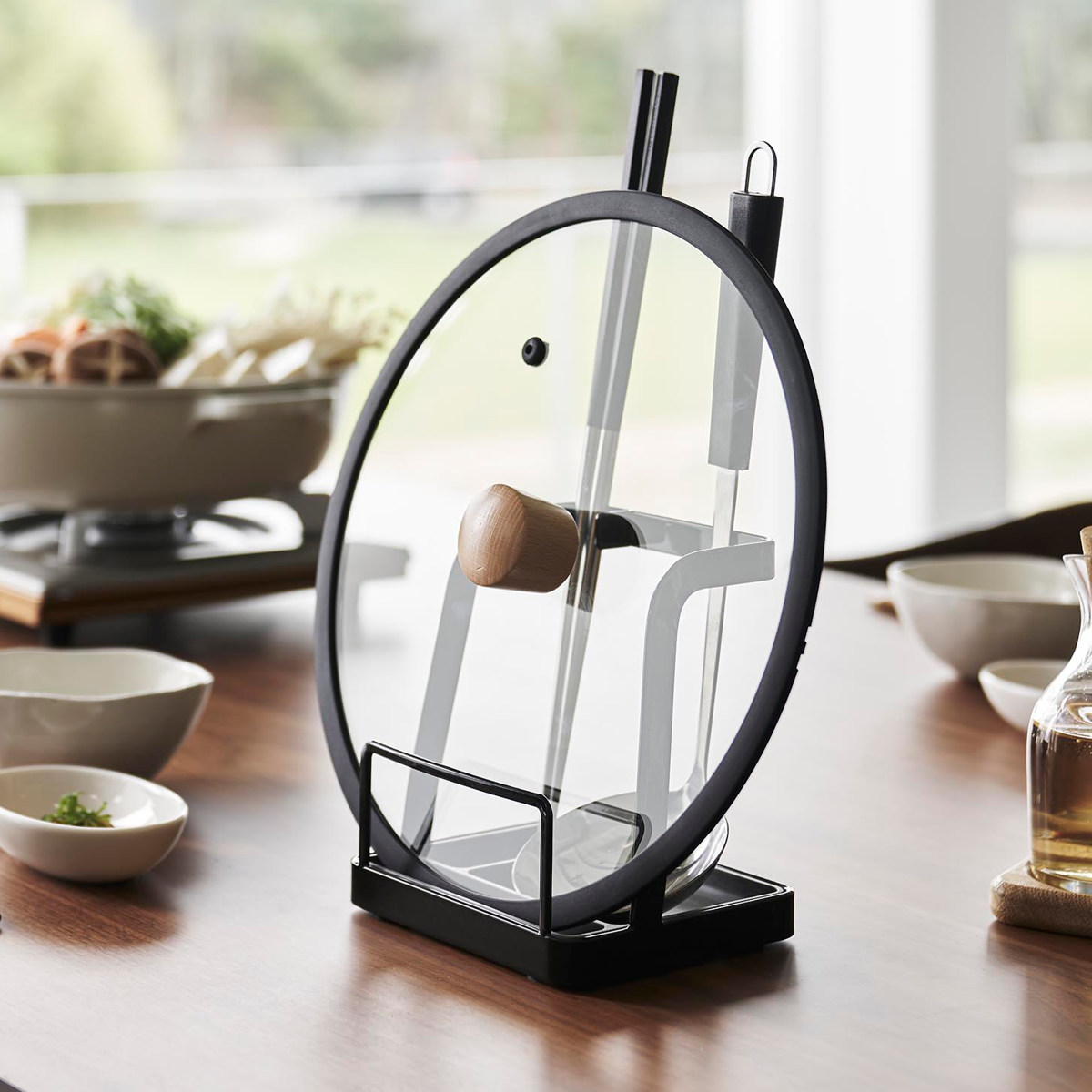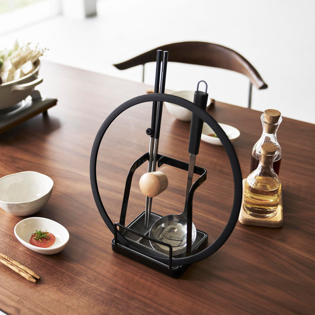 調理中のお玉・菜箸・鍋蓋を立て掛けて一時置きできる、多機能で便利なお玉スタンド Lサイズです。置き場に困るキッチンツールをまとめて収納できるので、食卓でお鍋の際にも重宝します。