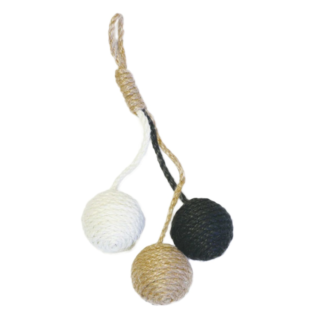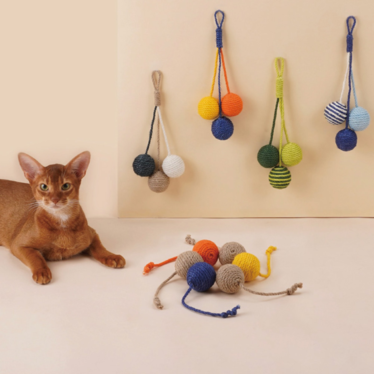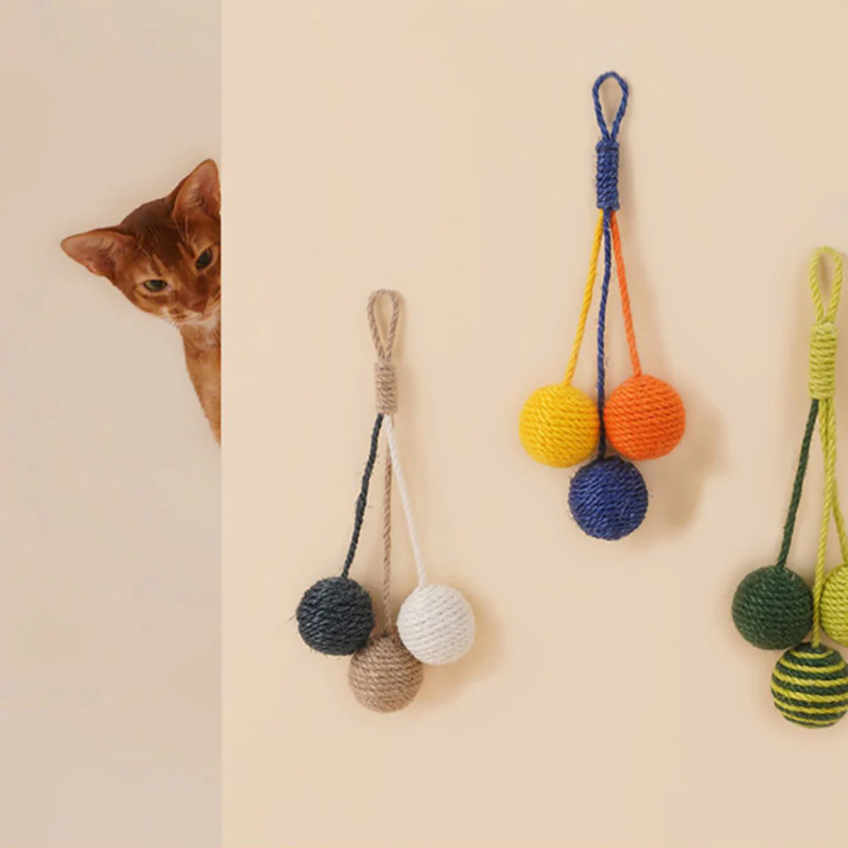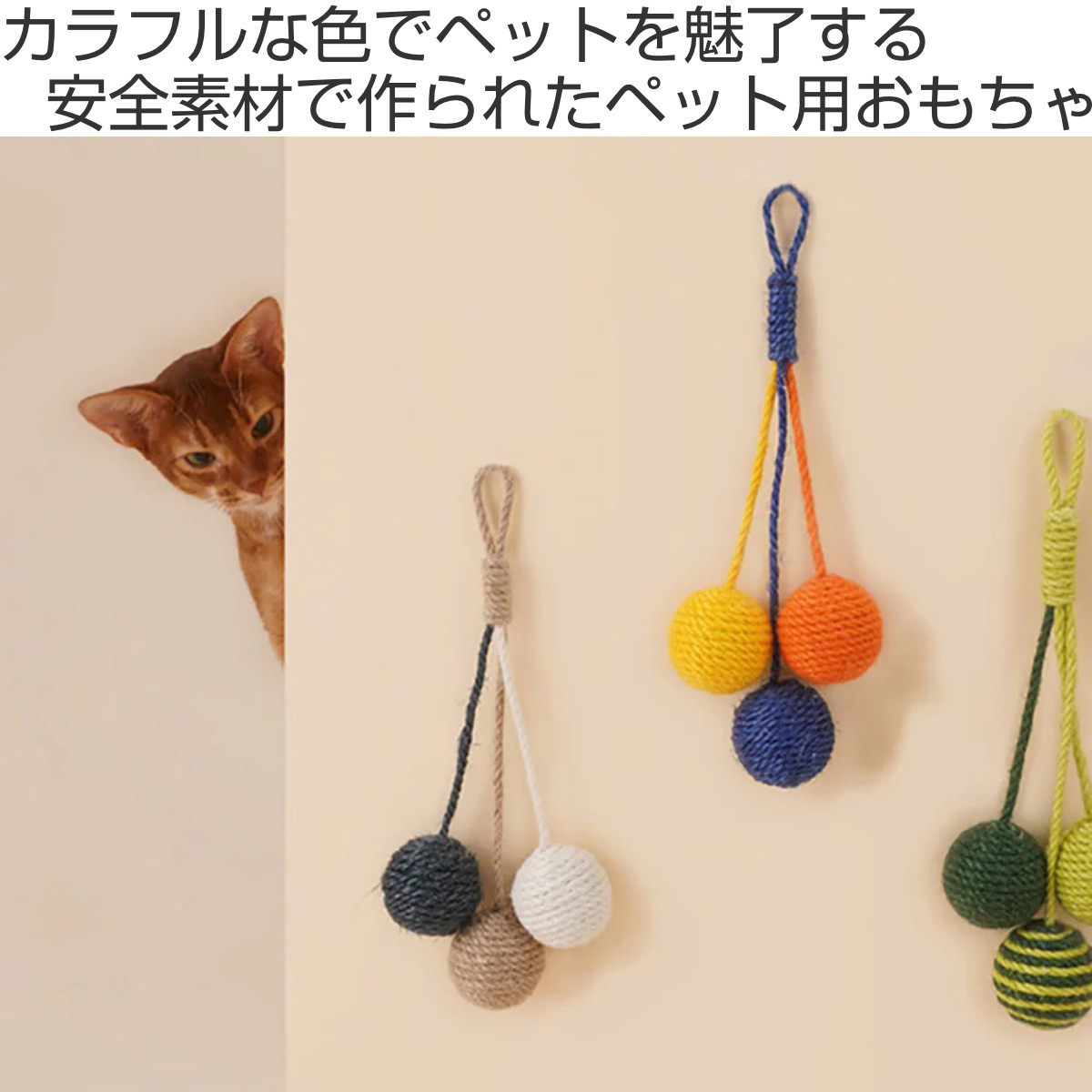 壁やドアノブに掛けられる麻ロープのペット用おもちゃです。 シンプルながらキャッチーな見た目で、お部屋のインテリアも明るくなります。 ドアノブで揺れるボールに猫ちゃんは興味津々です。