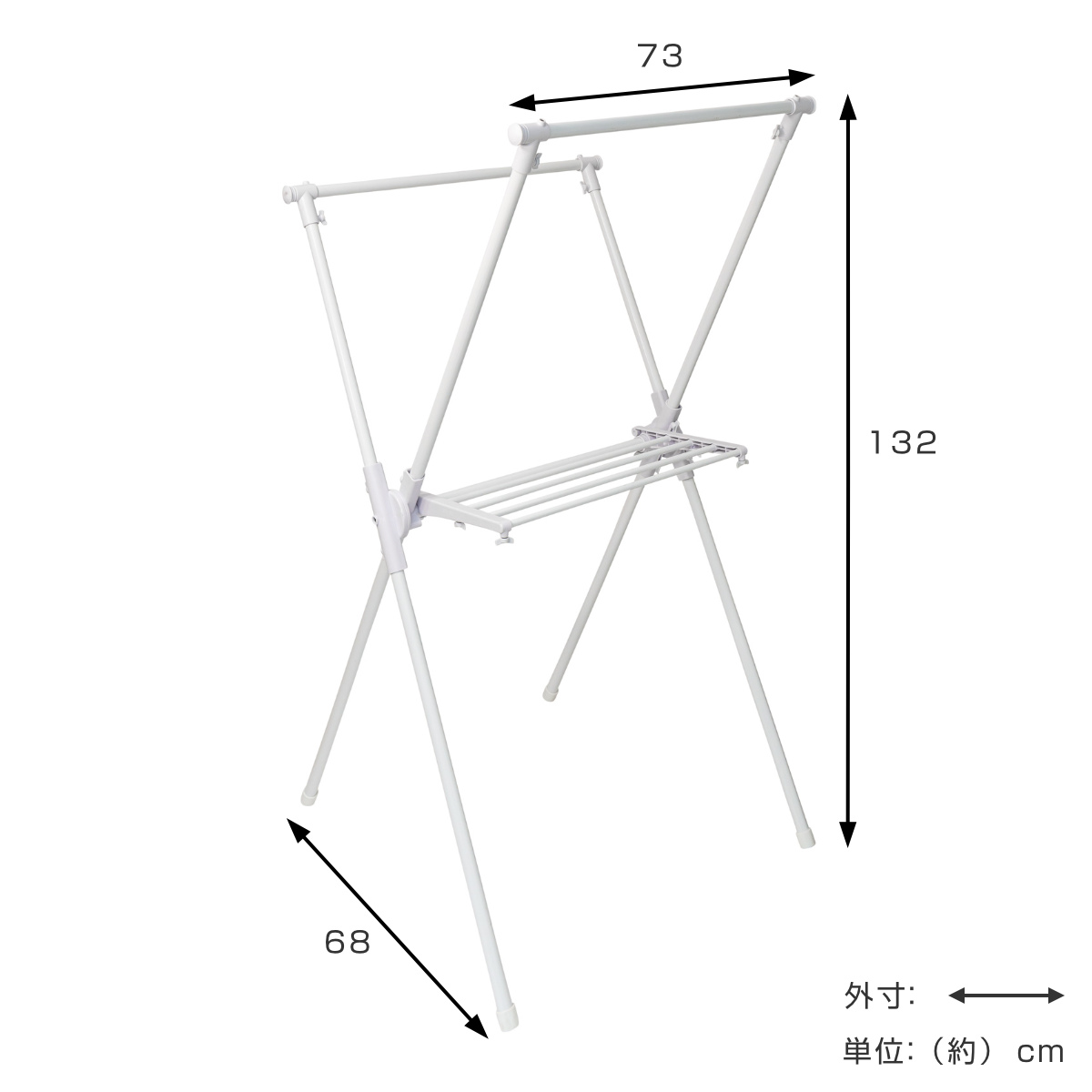 シンプルで使いやすいX型物干しスタンドです。お部屋に馴染みやすいホワイトカラーです。通気性の良い段違い設計なので、省スペースで効率良く干せます。組み立ては工具不要の簡単設計なのもポイントです。