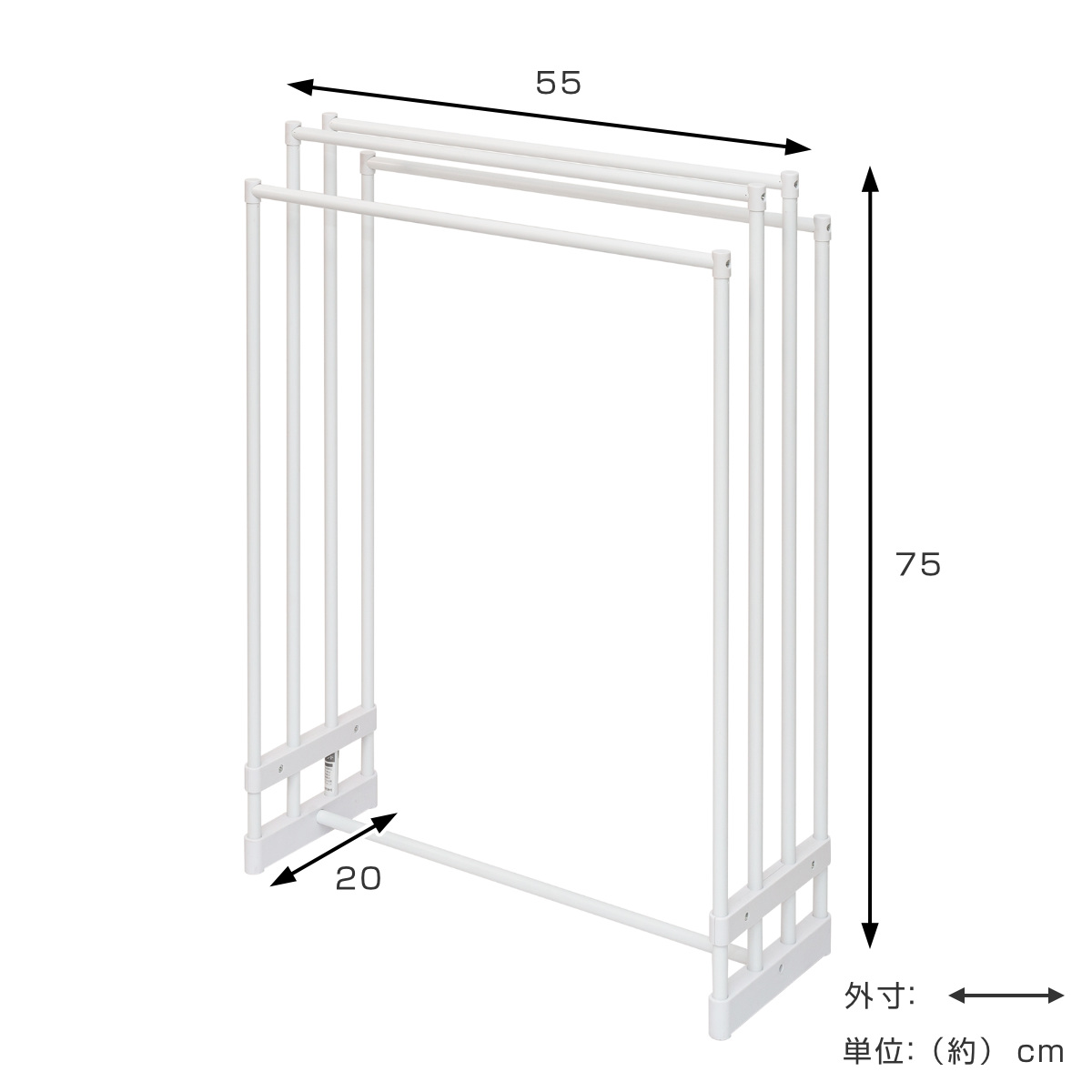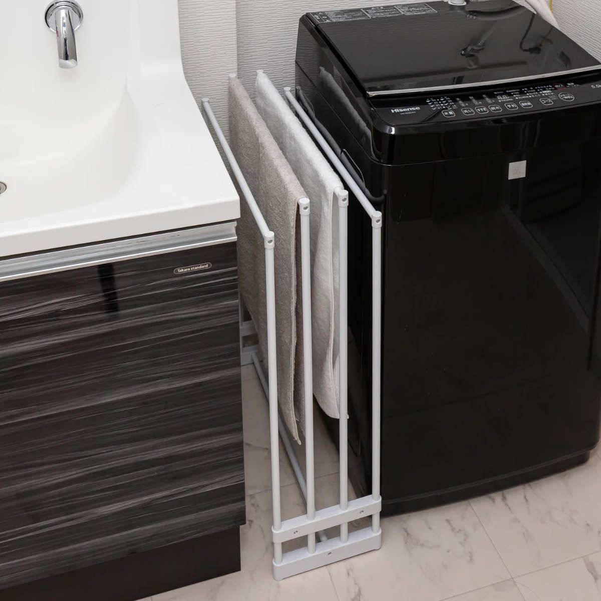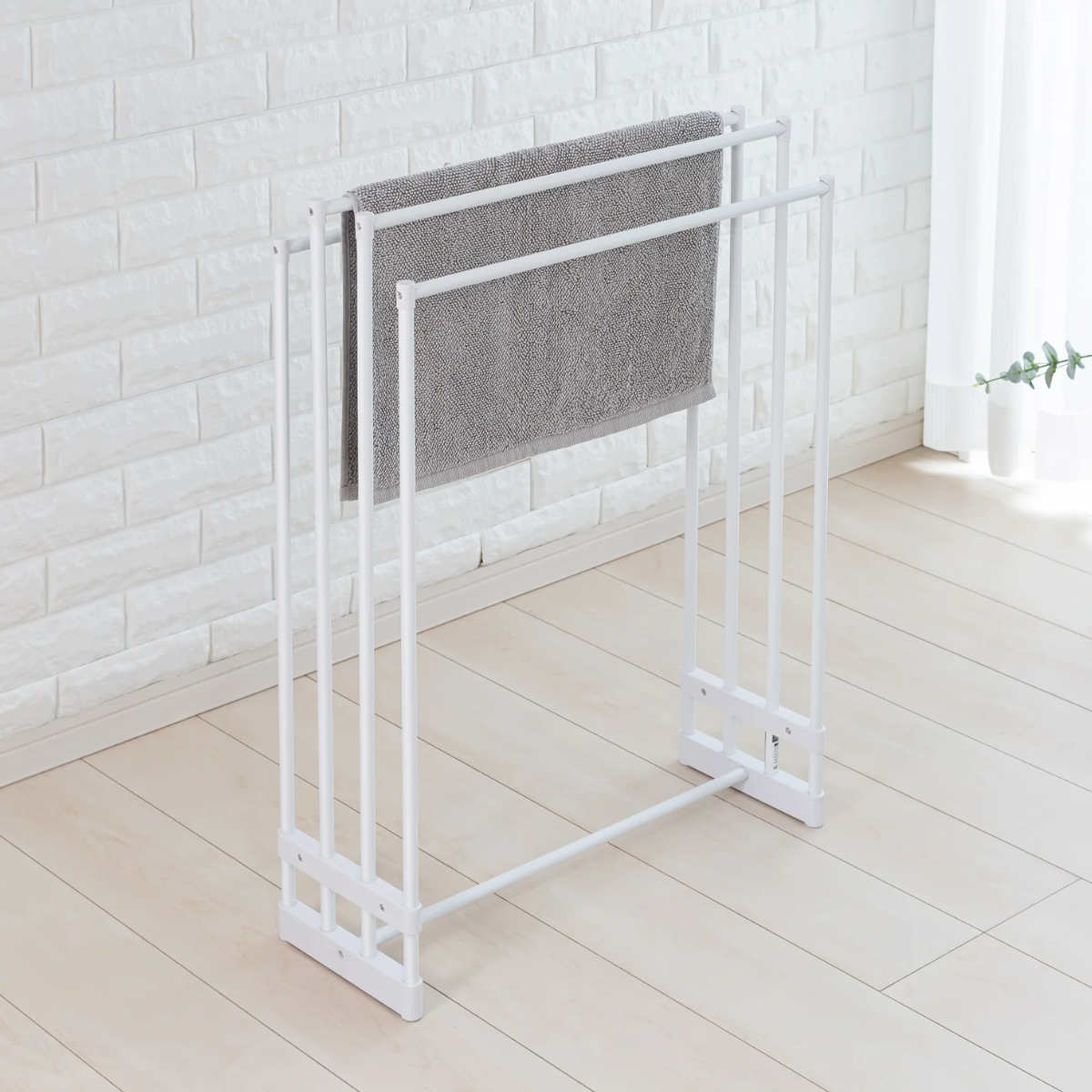 バスルームや洗面所でのタオル干しに最適なタオルスタンドです。コンパクトで省スペース設計なのに、約50cmまでのミニバスタオルが4枚干せます。狭いスペースでもしっかりとタオルを干せるので、アパートやマンションの住まいにもぴったりです。