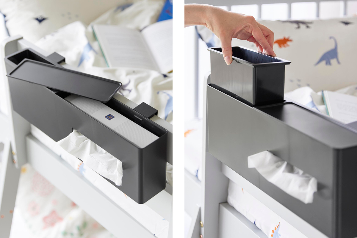 ティッシュボックス収納とゴミ箱が一体化した引っ掛け式のティッシュケースです。2段ベッドのフレームやヘッドボードなど手に取りやすい好きな位置に掛けるだけで使用できます。ベッドフレームの外側でも内側でも取り付けが可能です。