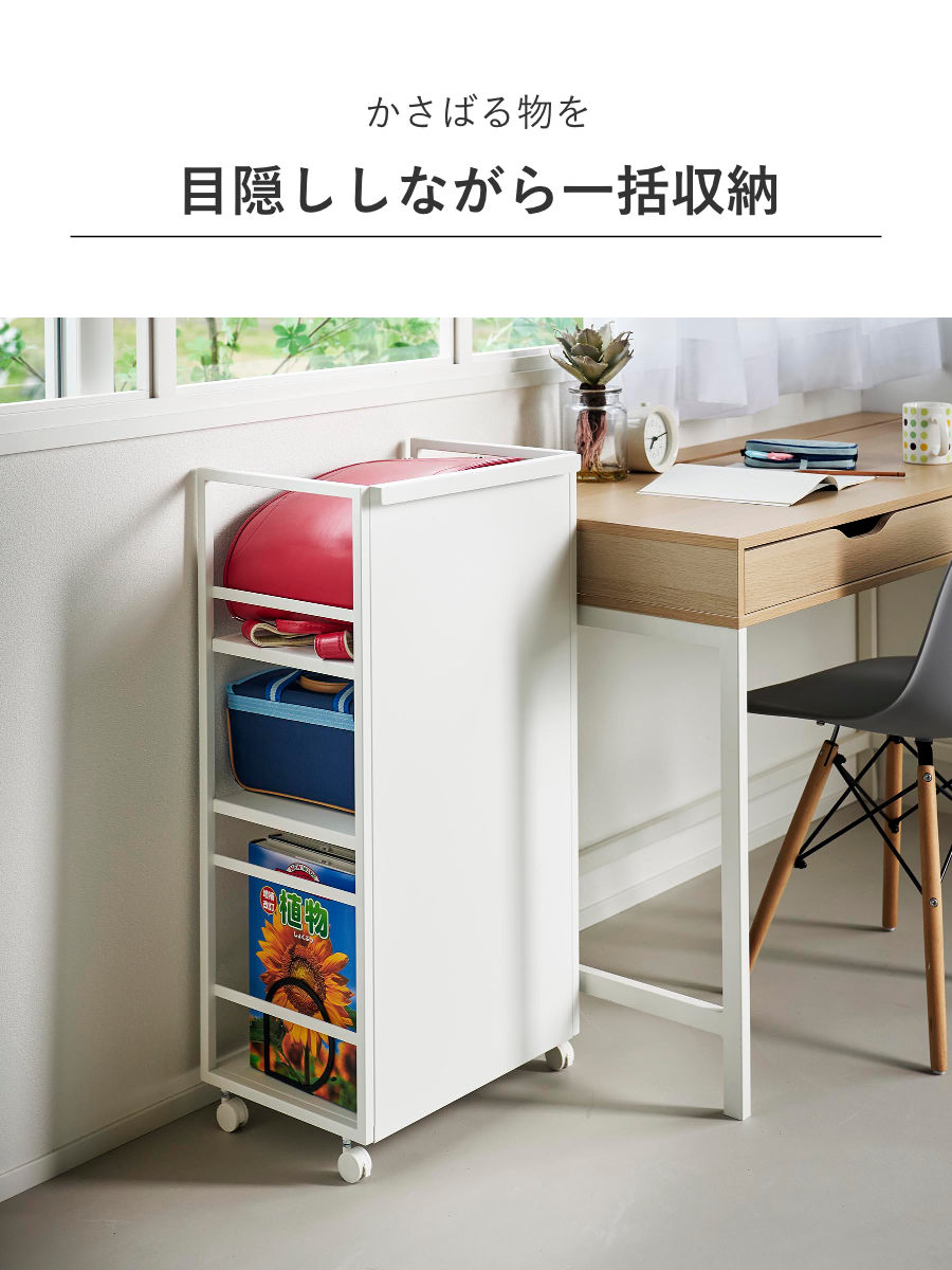 目隠し付きのかさばる物をまとめて収納できる3段タイプのワゴンです。よく使うけど、普段は隠れてて欲しいものの収納に役立ちます。ハンドルやキャスターが付いているので、移動やお掃除の際も簡単に動かす事ができます。