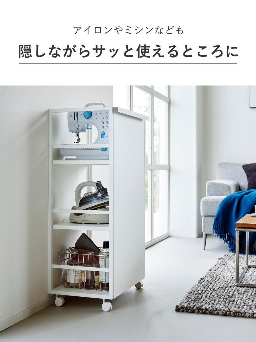 かさばるミシンやアイロン用品の収納にもおすすめです。出しっぱなしにすると生活感が出すぎてしまう、でも毎回わざわざ出すのもめんどくさい、そんな悩みを解消してくれます。普段から使いやすく、スッキリと収納できるので便利です。