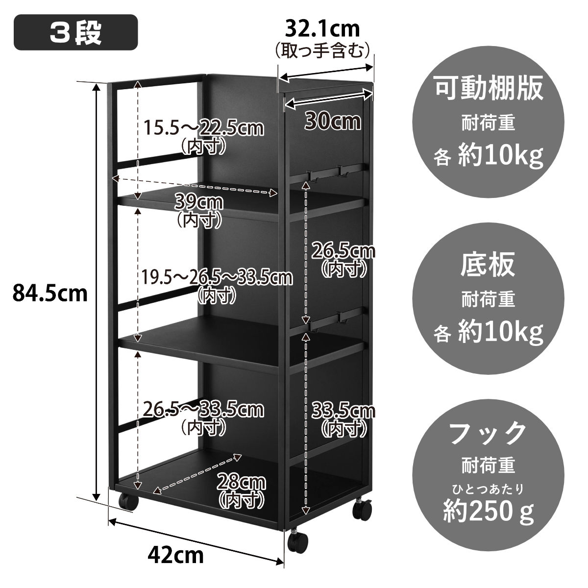| サイズ | 約 幅42×奥行32.1×高さ84.5(cm) 下段:幅39×奥行28×高さ26.5~33.5cm 中段:高さ19.5~26.5~33.5cm 上段:高さ15.5~22.5cm |