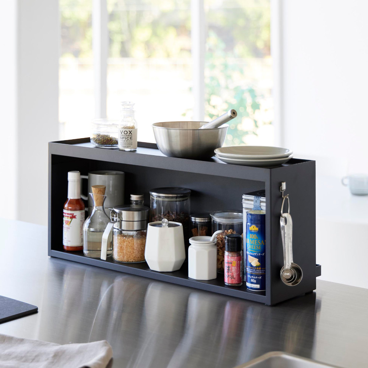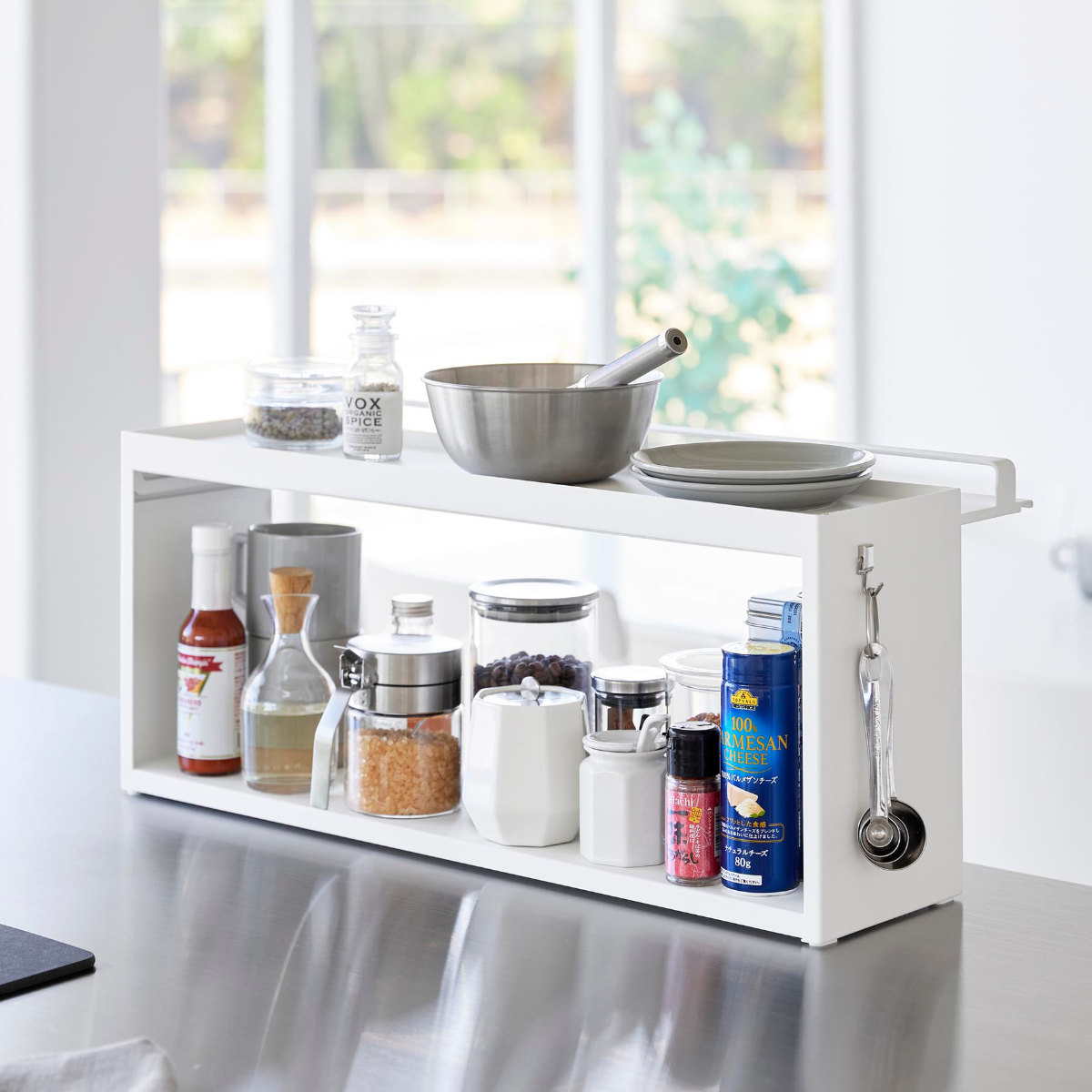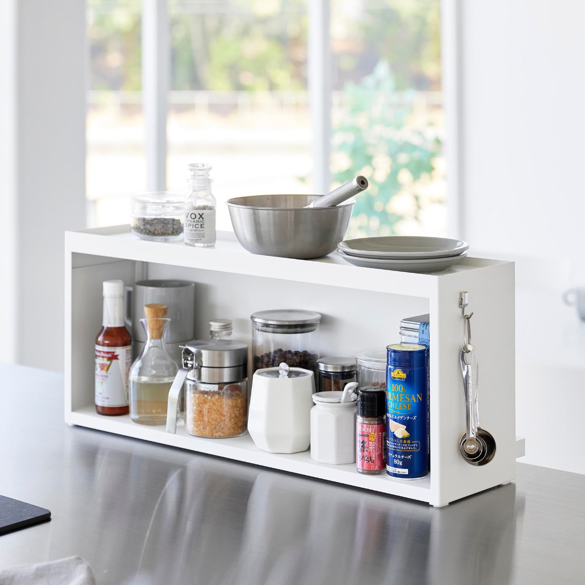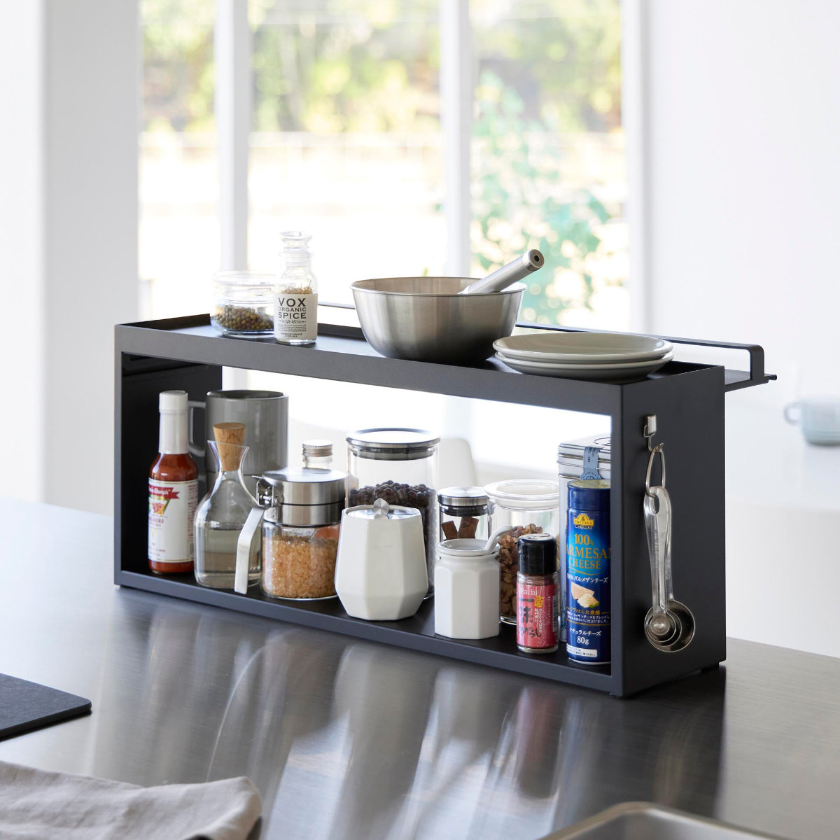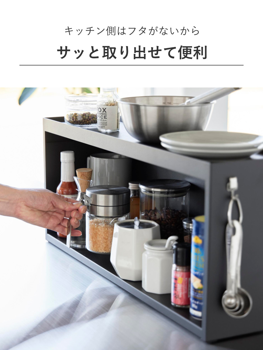 キッチンのカウンターに置ける奥行き15cmの収納ラックです。リビングからはスッキリ隠せて、キッチンからは使い勝手の良さが嬉しいポイントです。