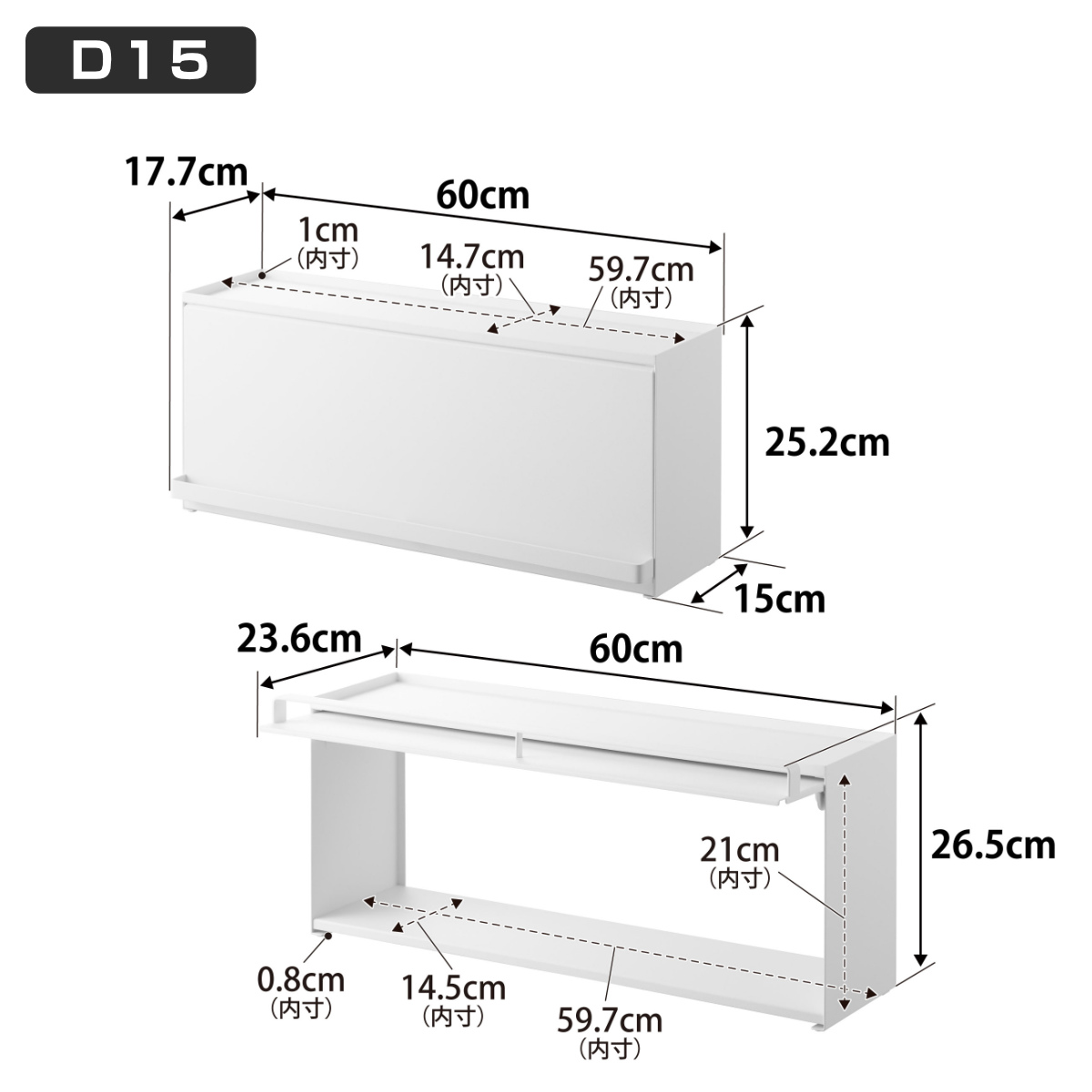 | サイズ | 約 幅60×奥行17.7×高さ25.2(cm) 天板:幅59.7×奥行14.7×高さ1(cm) 収納部:幅59.7×奥行14.5×高さ21(cm) (有効内寸・ローラー部含まず) |